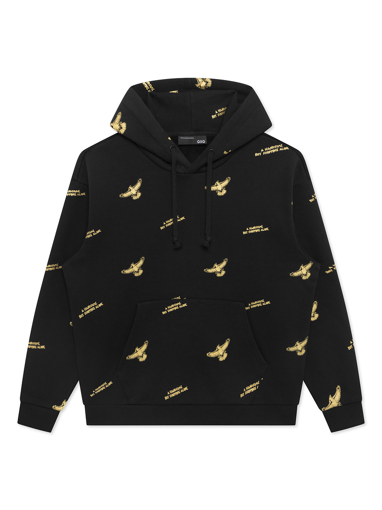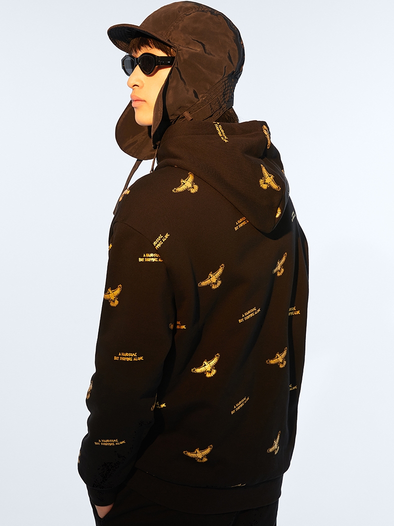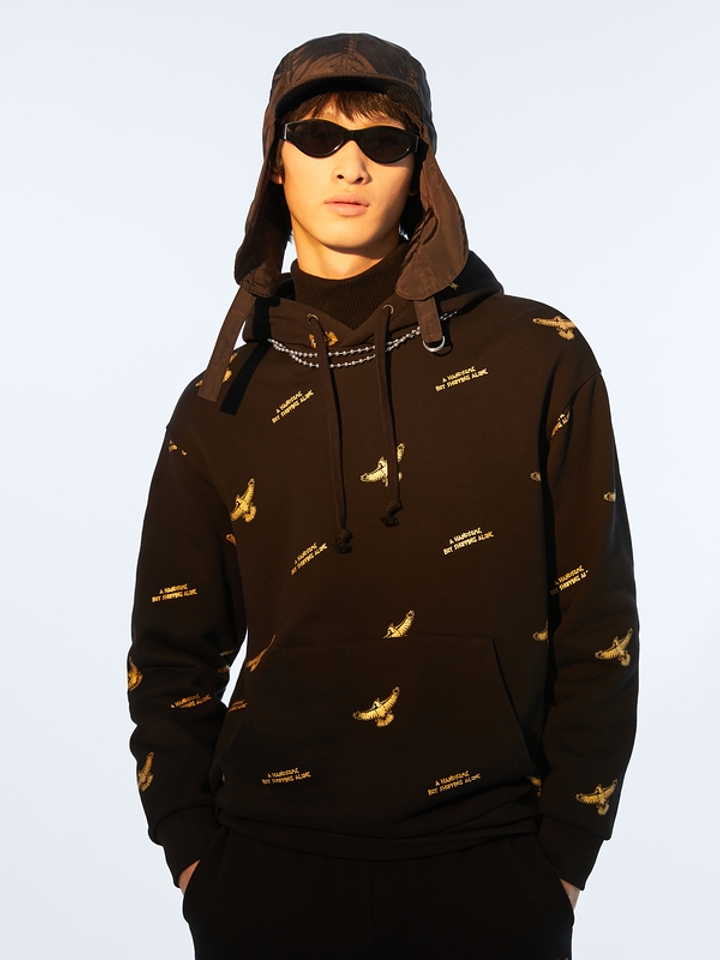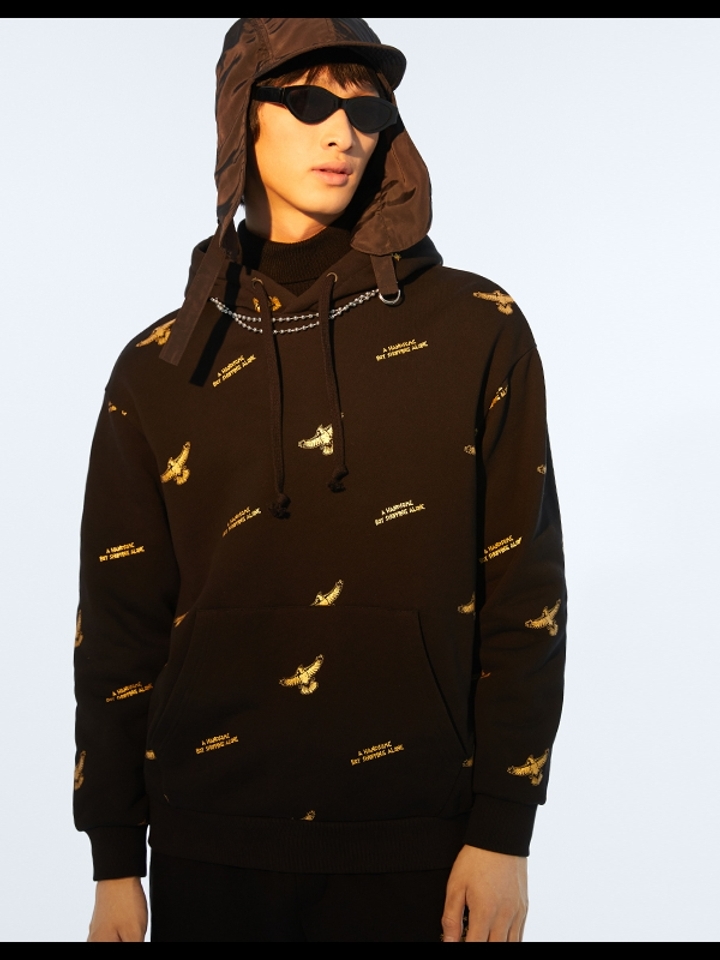 青春流行风格设计的连帽套头卫衣,个性的烫金花纹点缀,能够轻松打破纯色衣物带来的单一与沉闷,版型设计宽松搭载落肩长袖,尽显慵懒随性感。