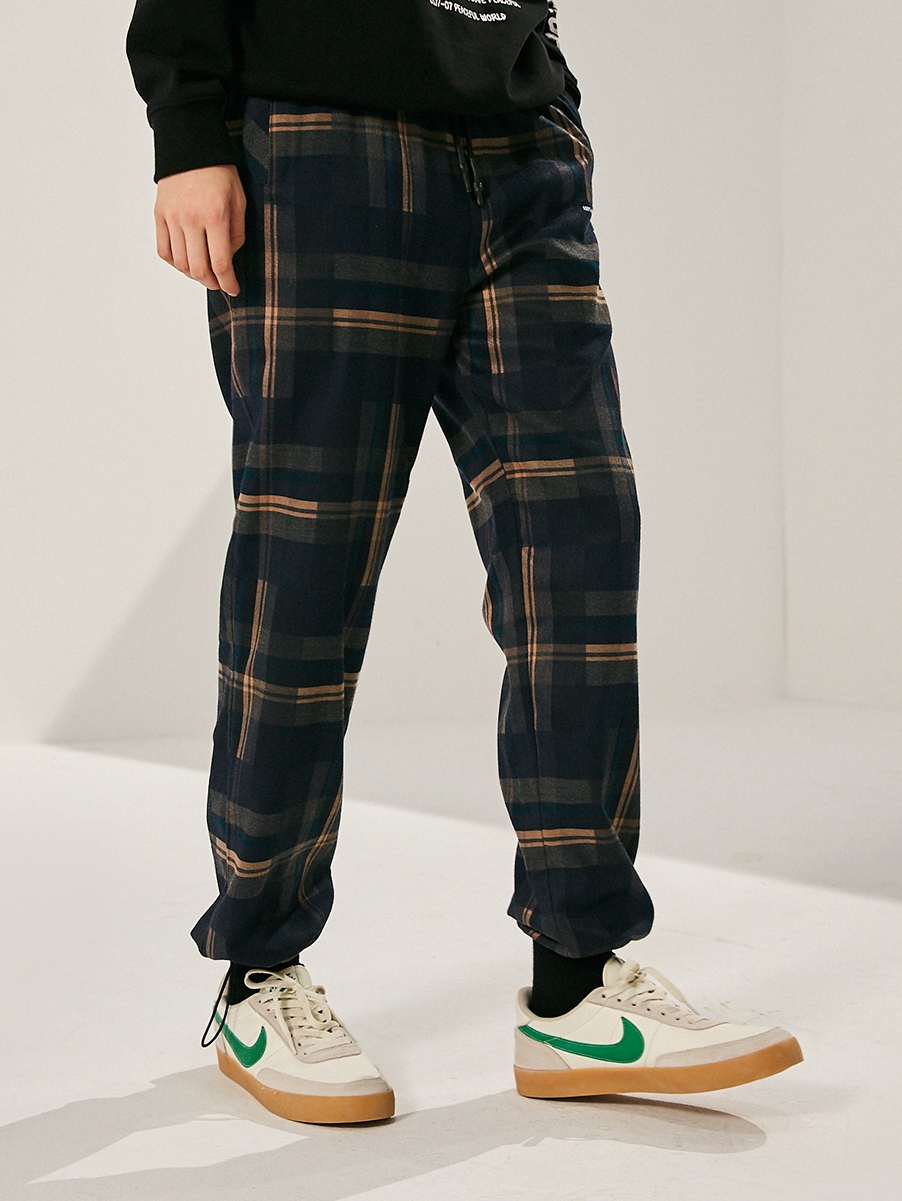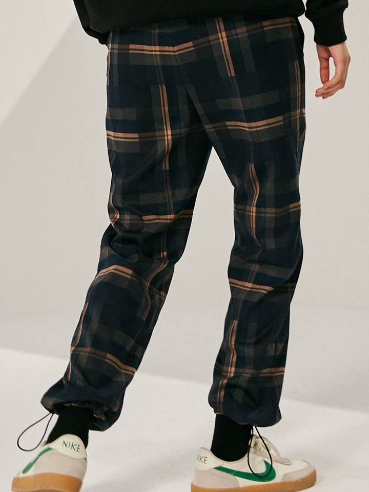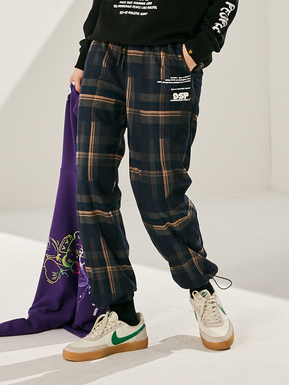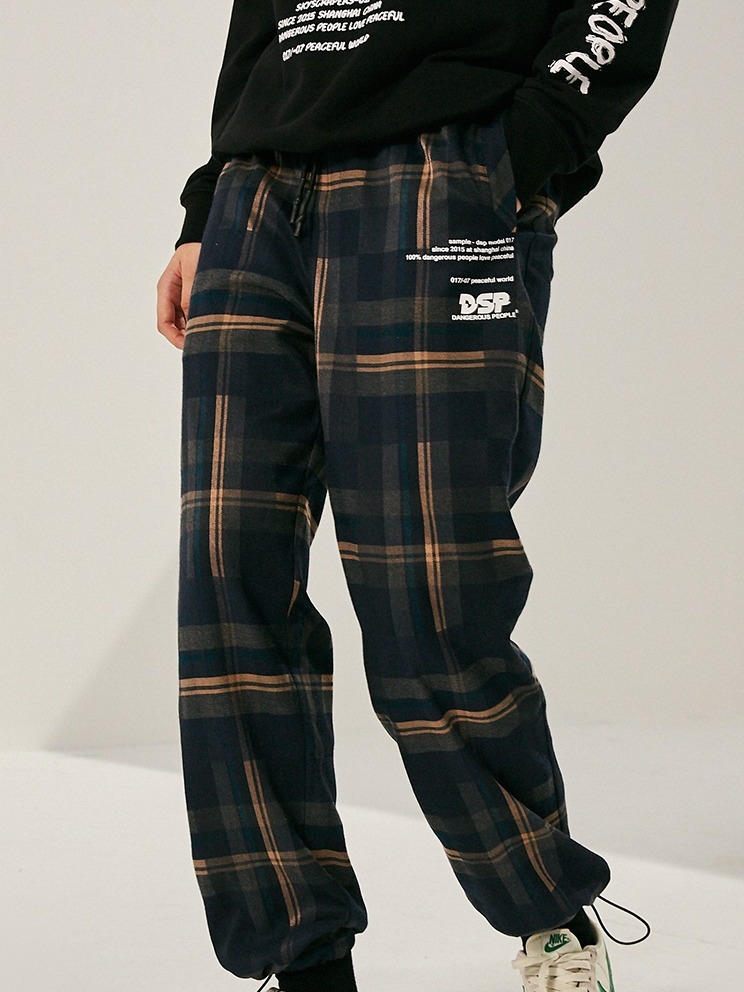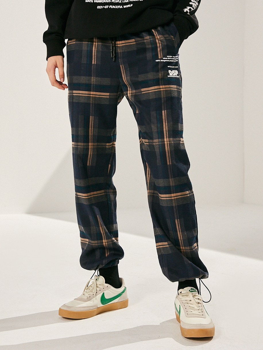 双腰头设计,易于穿脱,时尚方便;优选面料加印花格子和字母设计,个性与品质兼具;弯型口袋。