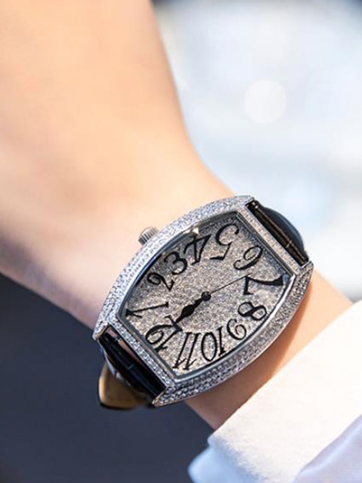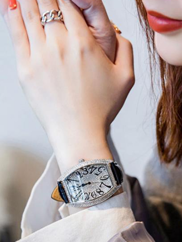 50mm的大表盘,镶嵌高贵的施华洛世奇钻,尊贵无比。搭配尊贵真皮表带,给手表增添了几分轻盈和飘逸。