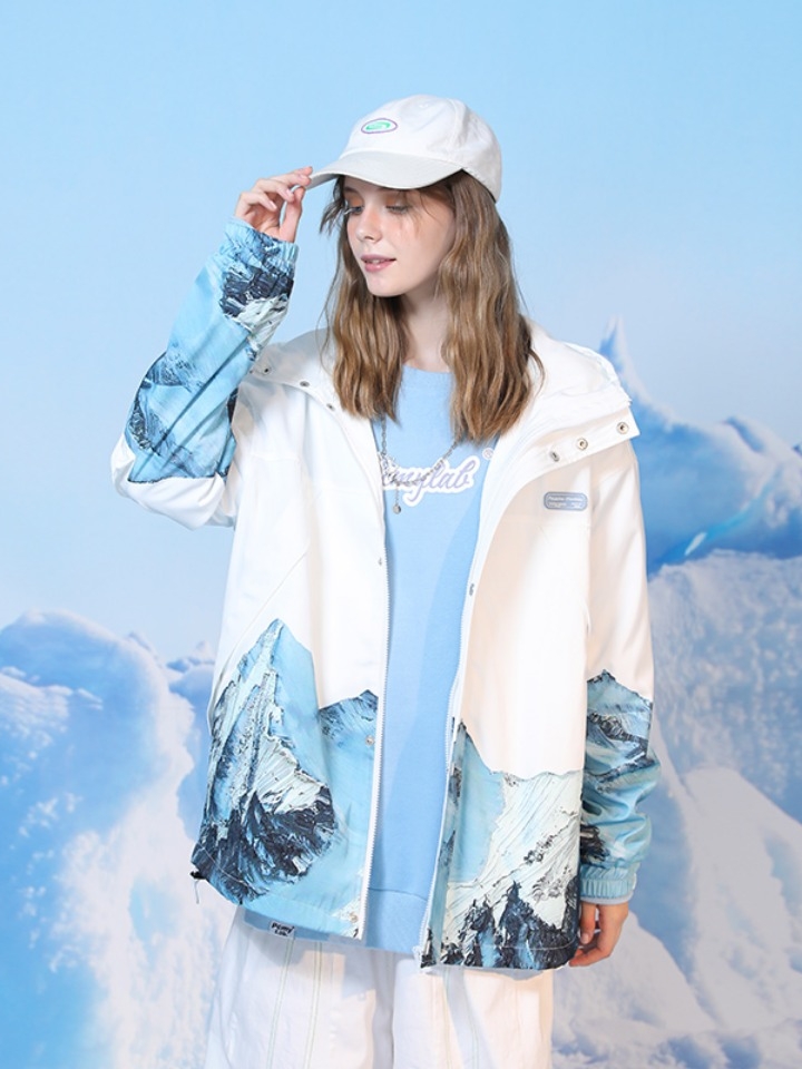 一款情侣冲锋衣,连帽设计,防风保暖;精致的雪山印花点缀衣身,时尚前卫,青春活力感十足;宽松的版型,包容性好,各种身材都能驾驭。