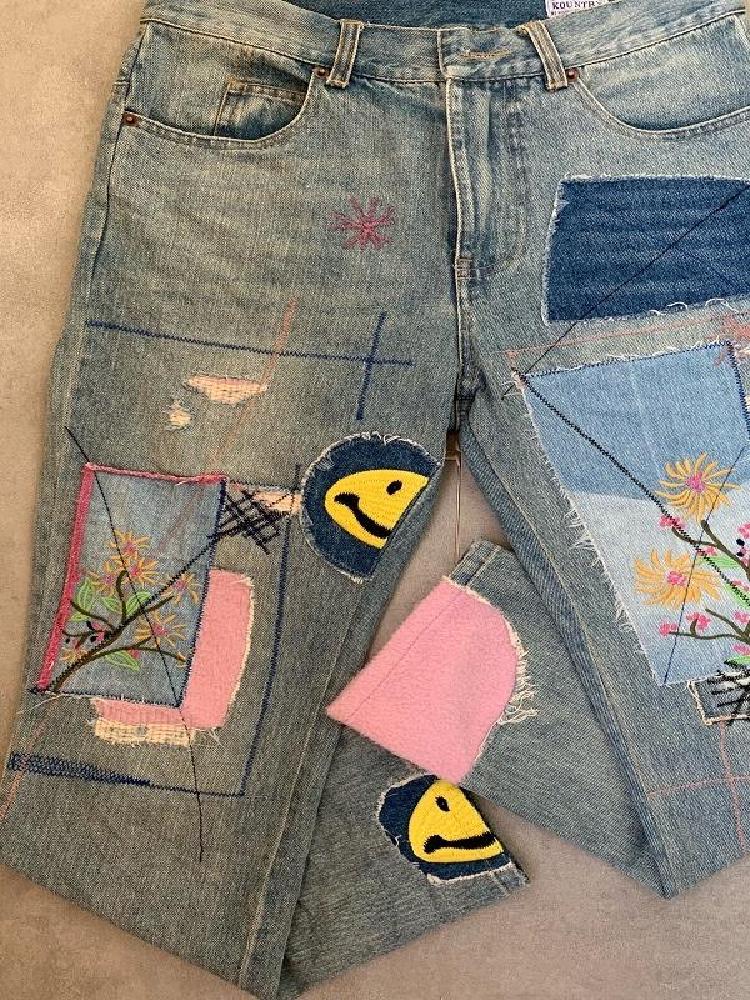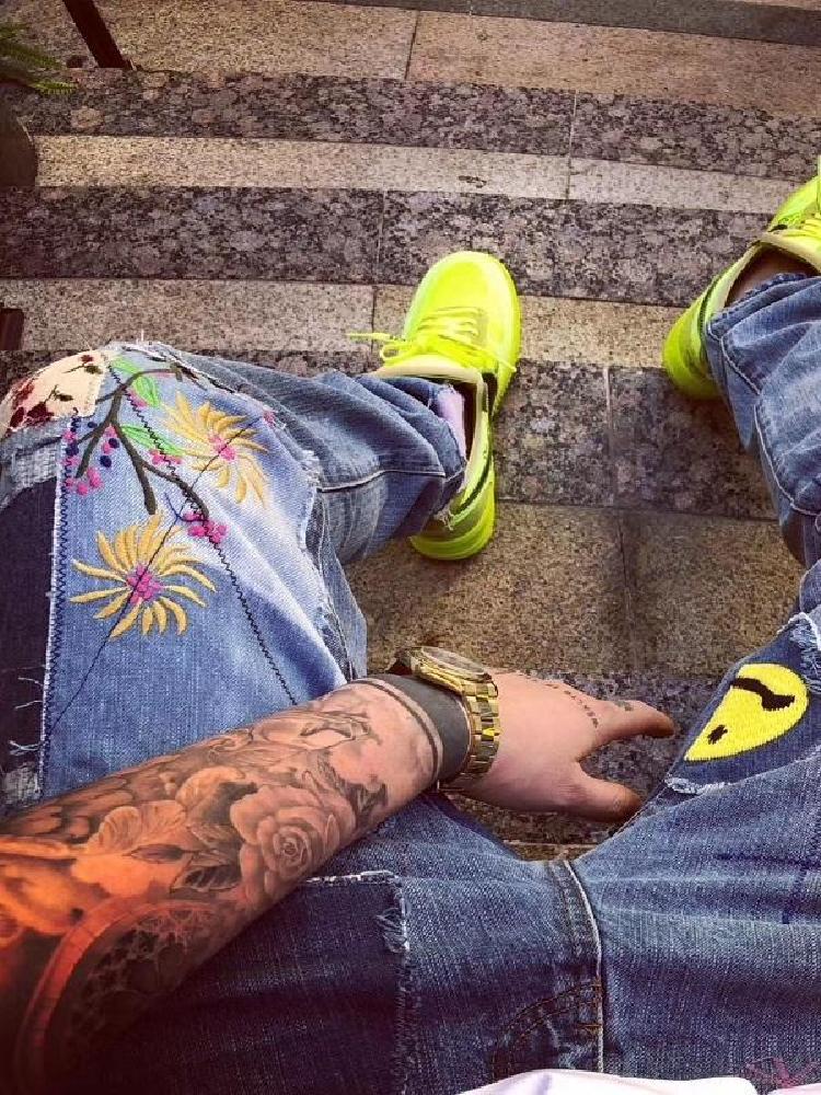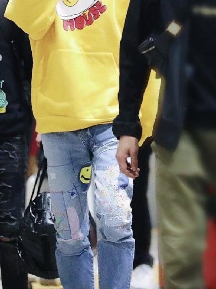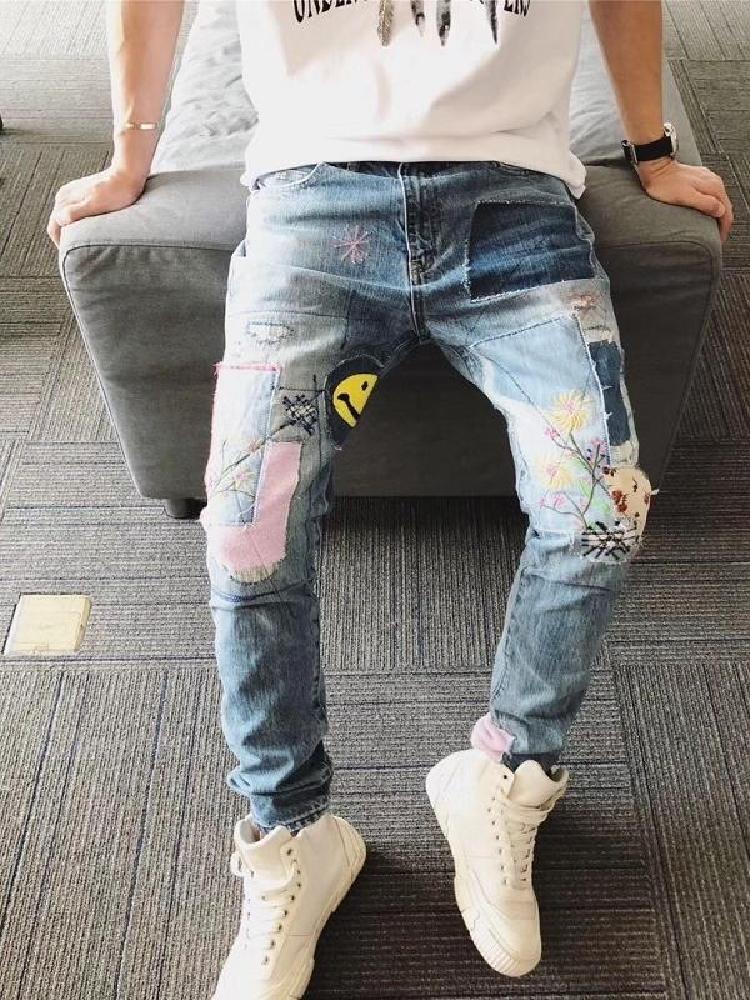一款高街风的破洞牛仔裤,一边是膝盖处的大破洞设计,另一边是破洞后别针别住的设计,真的是非常个性。修身的版型,真的是高街范十足,搭配宽松的长版T恤,真的超级帅哦。