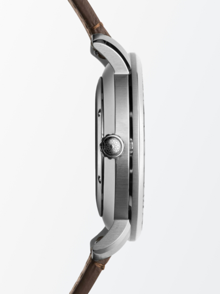 圆顶行星上升到fumee表盘的中心,增加了整体3D效果。外太空围绕地球,允许隐藏的浮动分钟被隐藏,直到轨道月亮显示时间,再加上荧光指针在黑暗中增加易读性。使用最好的美国制造的Horween皮革,配有快速释放系统,可快速轻松地更换工具。