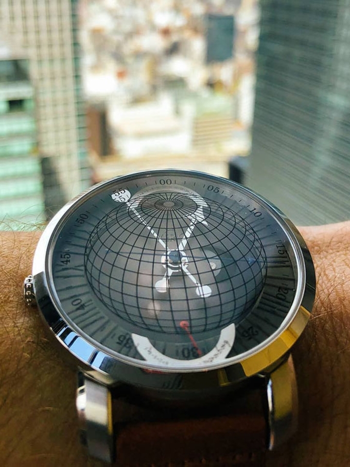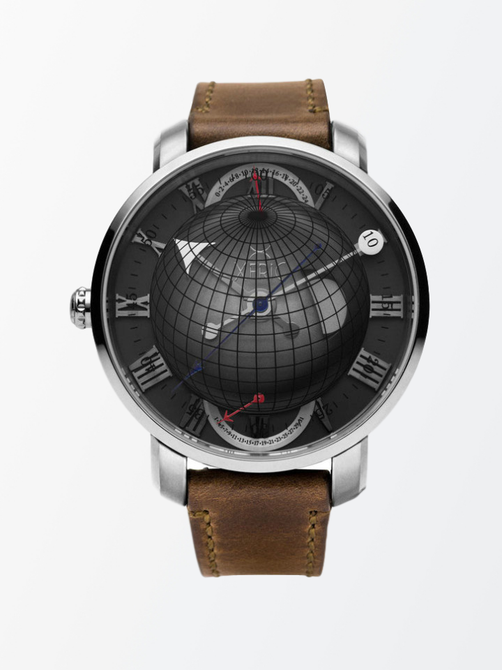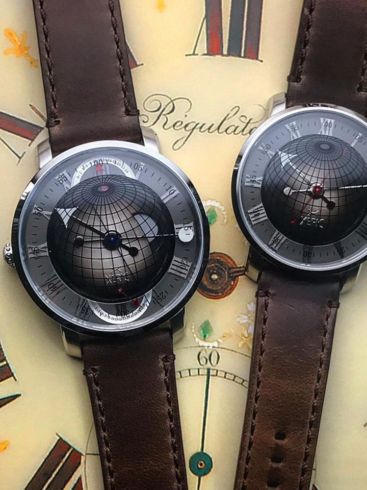 一款可视化显示我们旅行时间元素的手表,参考了18世纪的全球制造商,他们开始在地球周围的玻璃球上展示天体地图。经度和纬度线以及分钟都经过精心电镀到蓝宝石玻璃上,并与下面的层一起,创建一个独特的强制视角,随着视角的变化而变化。