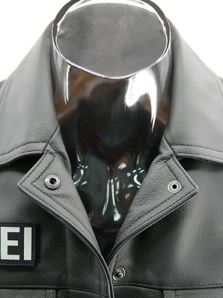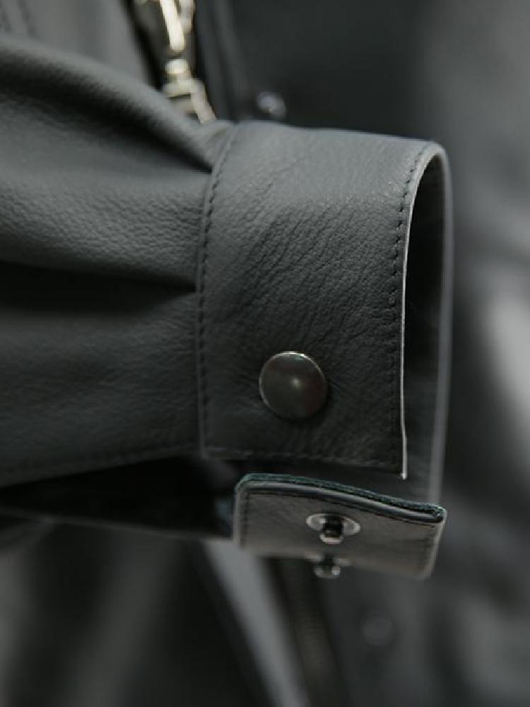 多部位的刺绣贴章充满了机车风气息;同时设计师采用磨砂牛皮材料作为衣身的主材,磨砂皮所特有的复古粗犷感与整体的棕色相融合,烘托出一种复古豪放的人格魅力;牛皮的面料搭配纯棉内里,兼具了保暖与舒适;立体的剪裁结合整体的硬朗感,展现出男性的阳刚与霸气。