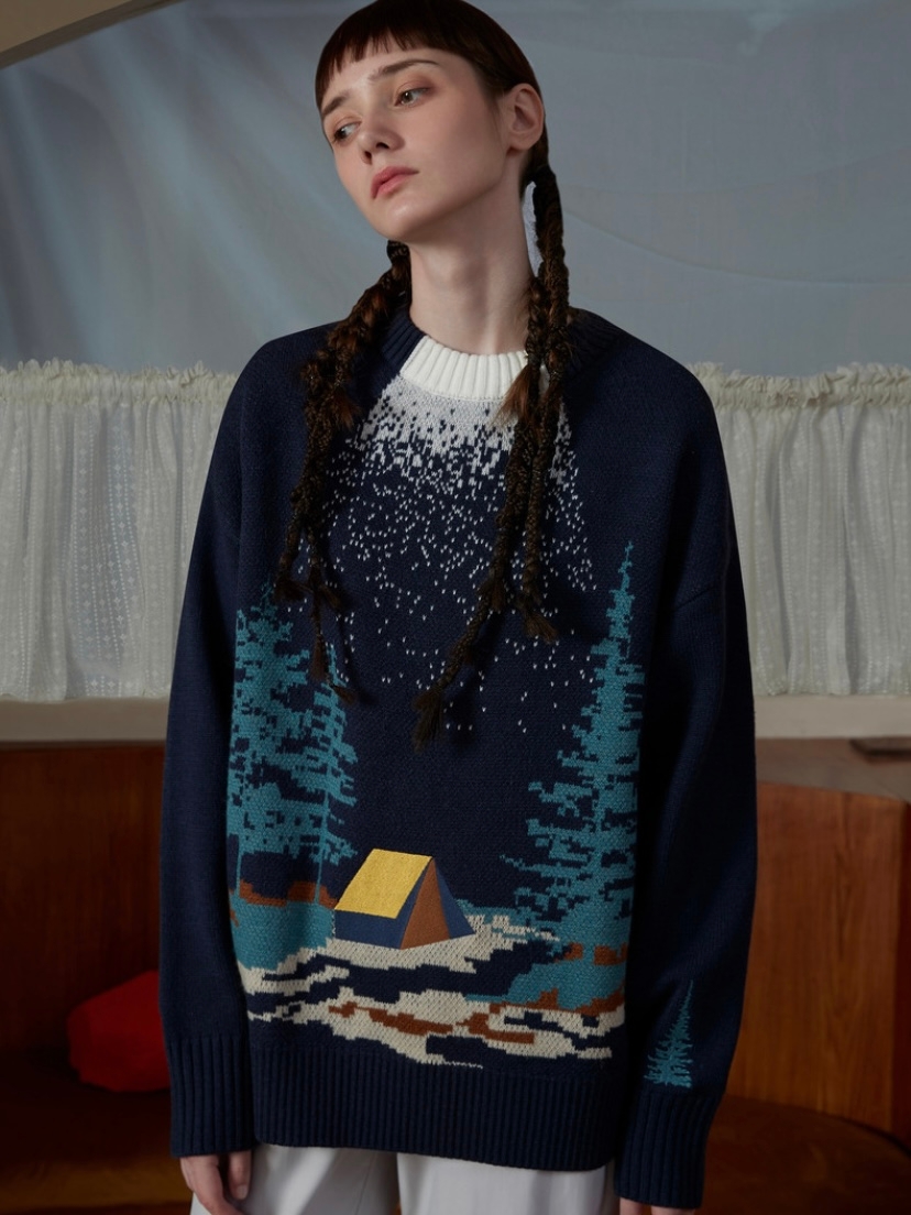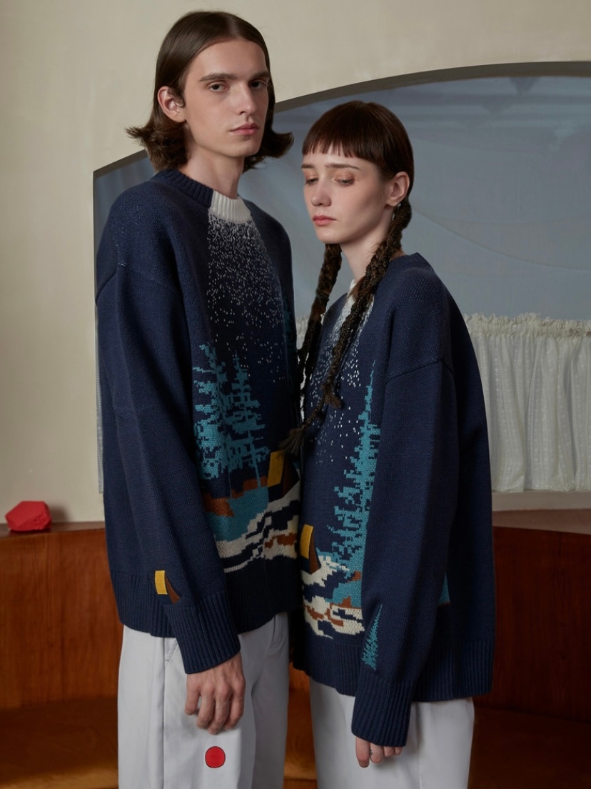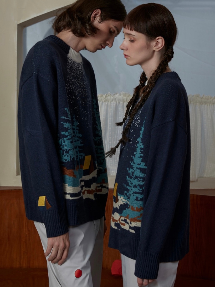 藏青色的毛衣,呈现出静谧内敛的气息,结合圆领廓形的衣身,也可以包容不同的身材,又具有随性和自在的穿着效果。