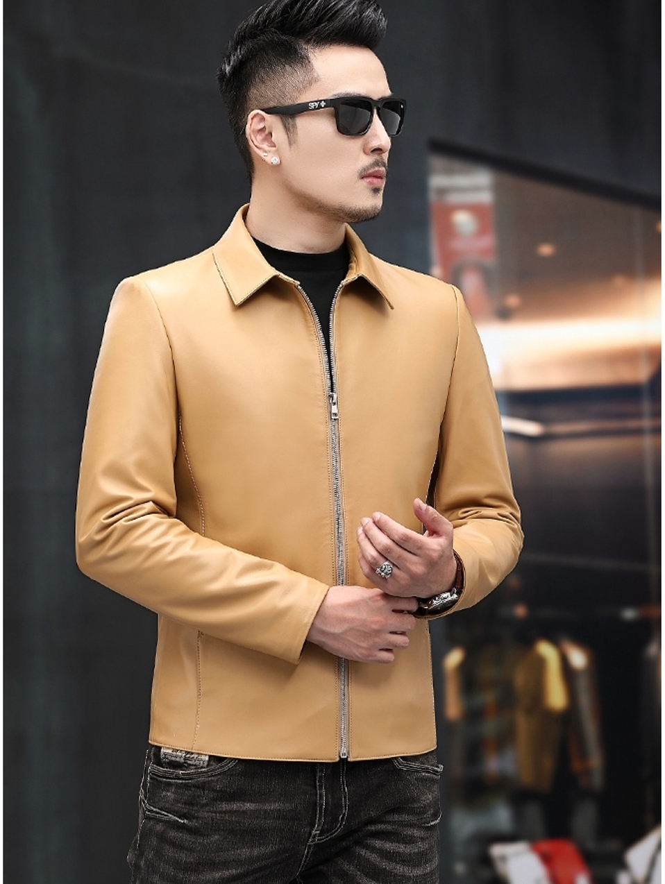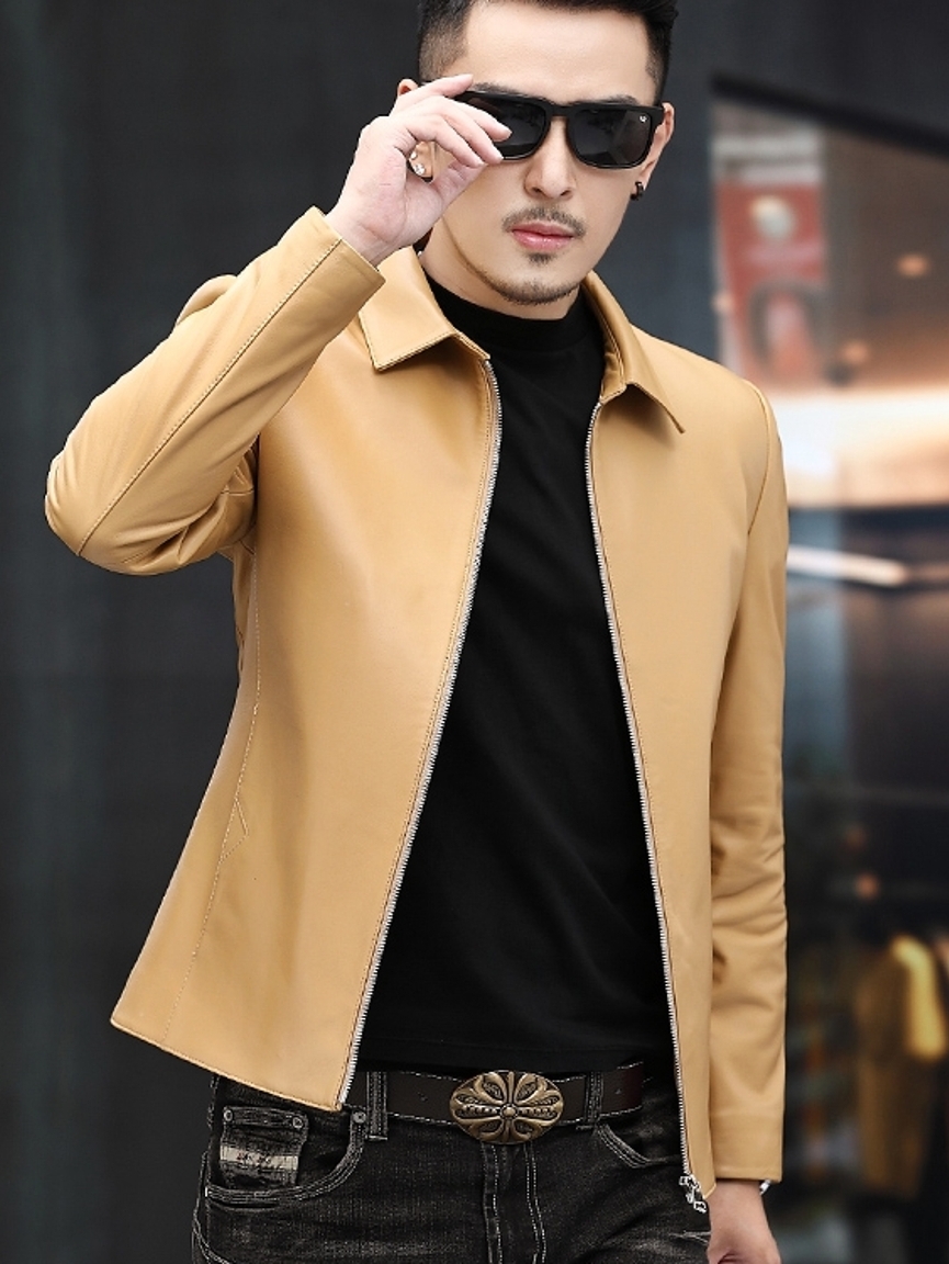 潮流韩版男士皮衣精选进口A级绵羊皮,免烫帅气有型;潇洒的立领设计,休闲大方,标准的走线,气质高雅;收腰设计让您的身材更加有型。