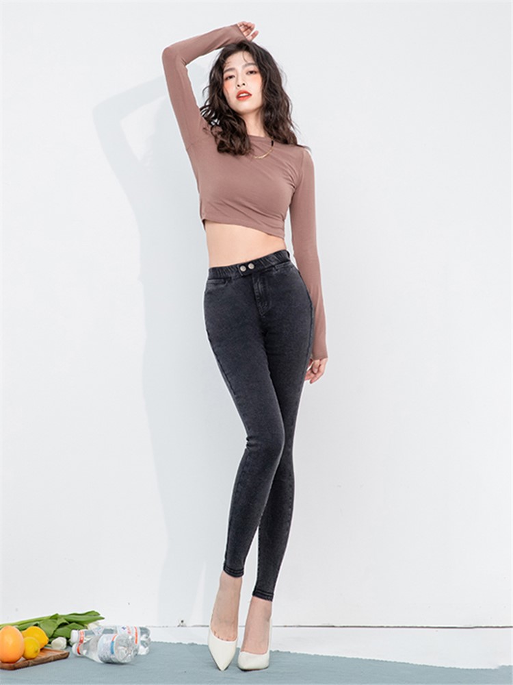 高腰牛仔裤瘦腿提臀显高挑,九分裤长,露出纤细脚踝。
