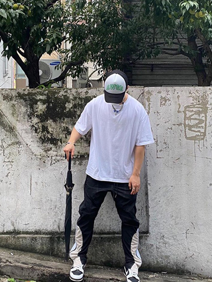 一款休闲百搭的拼接工装裤,搭配宽松朴素T恤衫,亮色棒球帽,让你活力十足。
