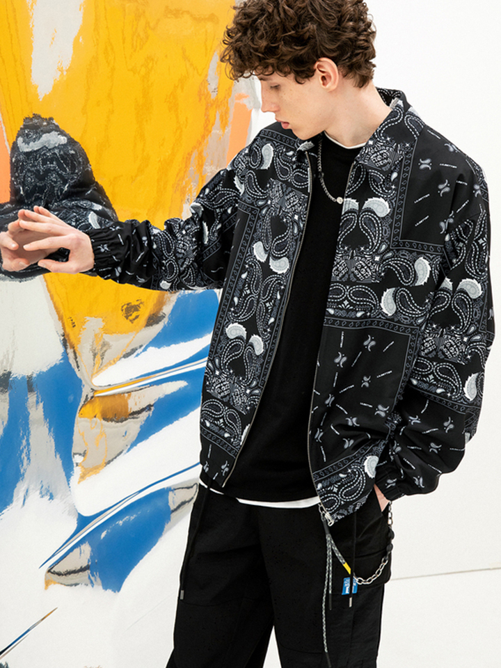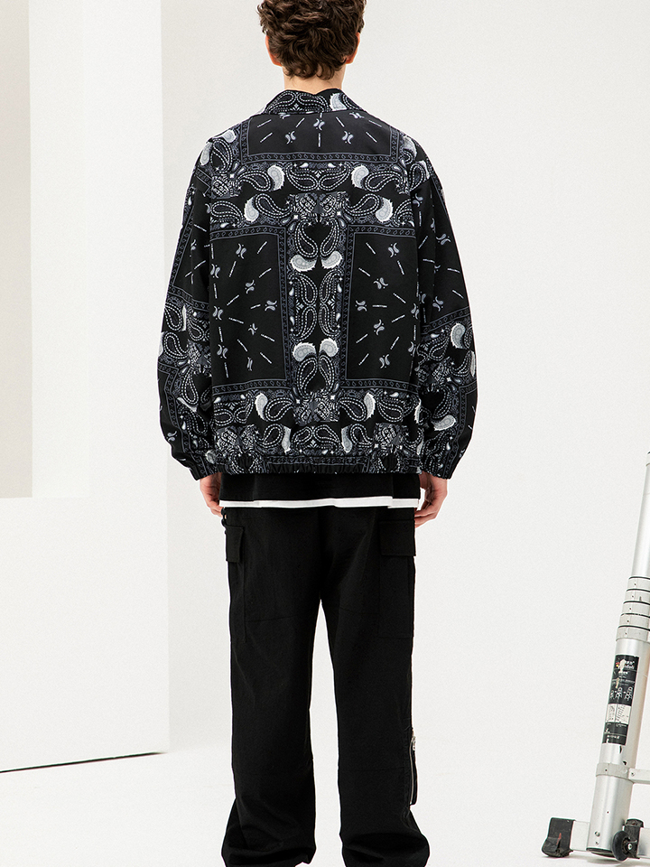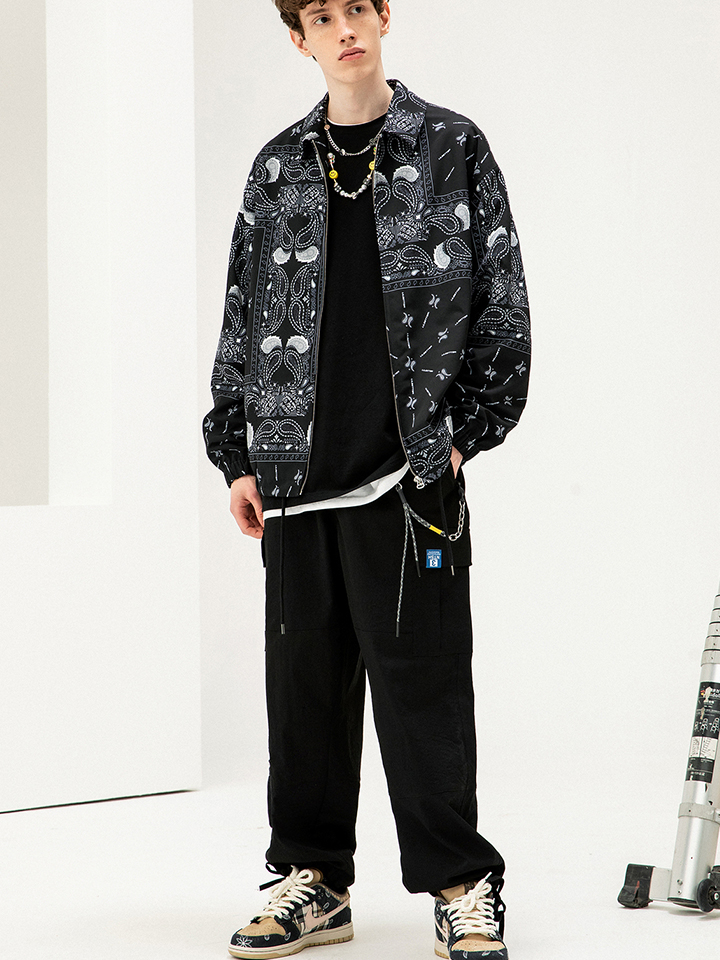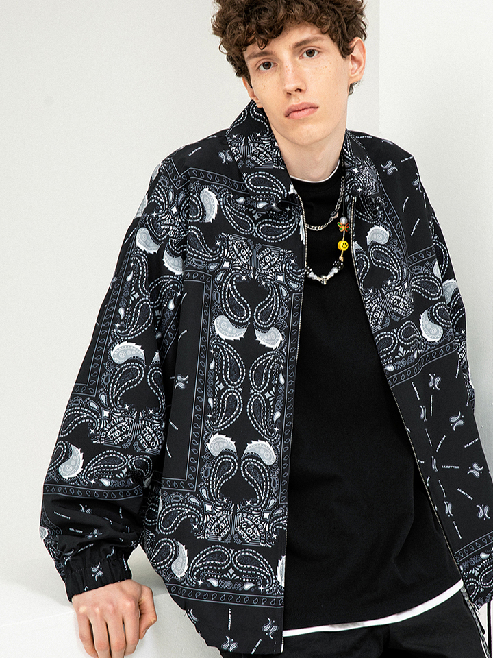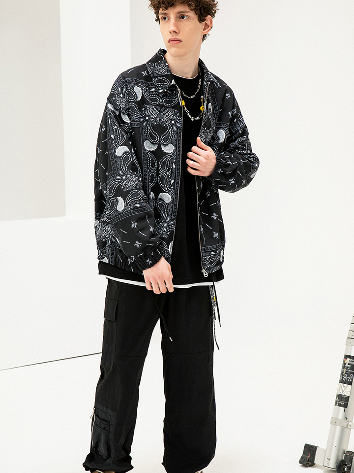 黑色的翻领外套满印腰果花图案,衣摆采用抽绳设计。