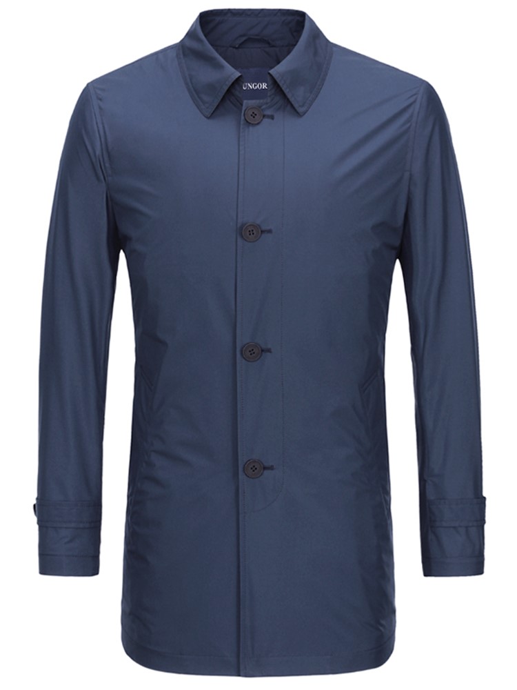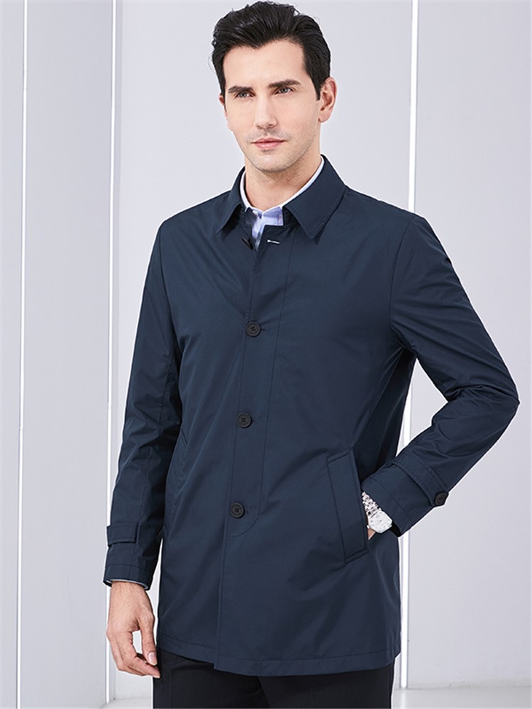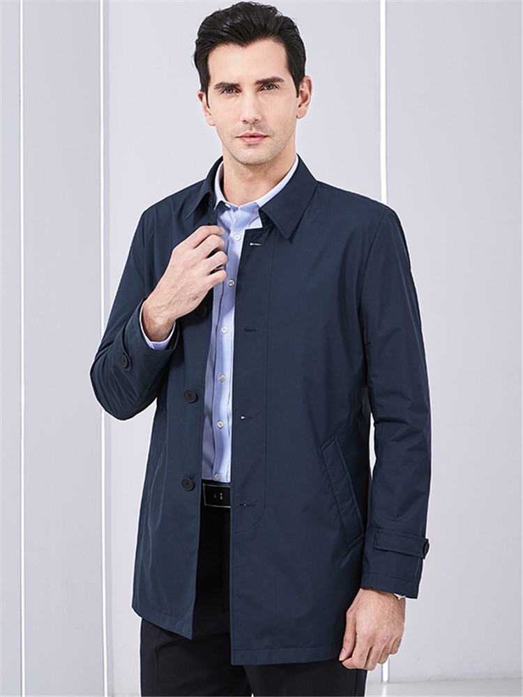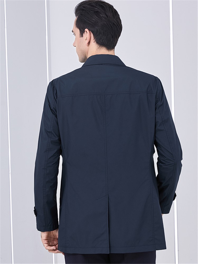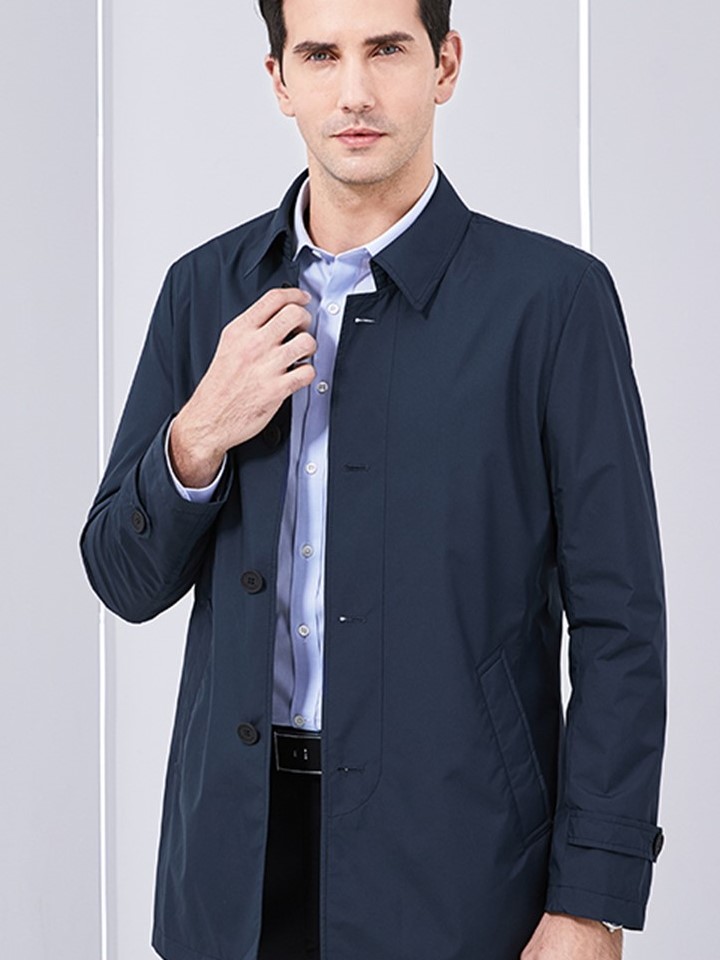 经典的中长款的风衣外套,深蓝色的色调低沉且百搭,很适合日常通勤和多种场合穿着,贴合身形不紧绷,更显高挑气质身形。对襟摒弃纽扣和拉锁,采用按扣对襟的设计,质感有型且方便。拉链斜插的对称衣兜,不仅手插兜凹造型,还更安全实用。