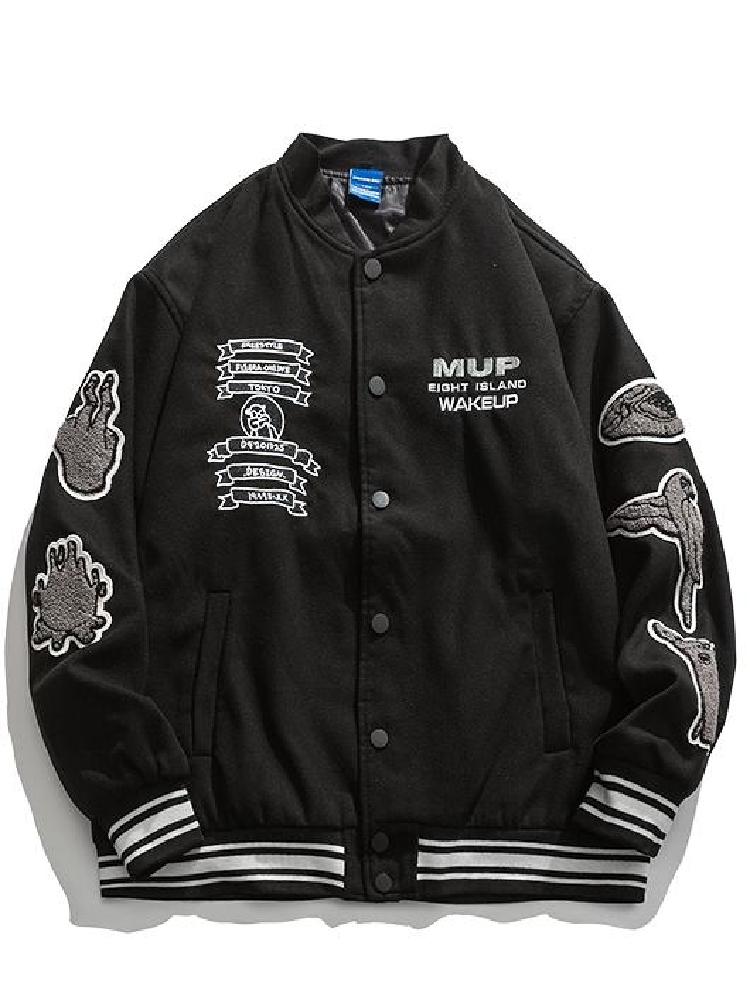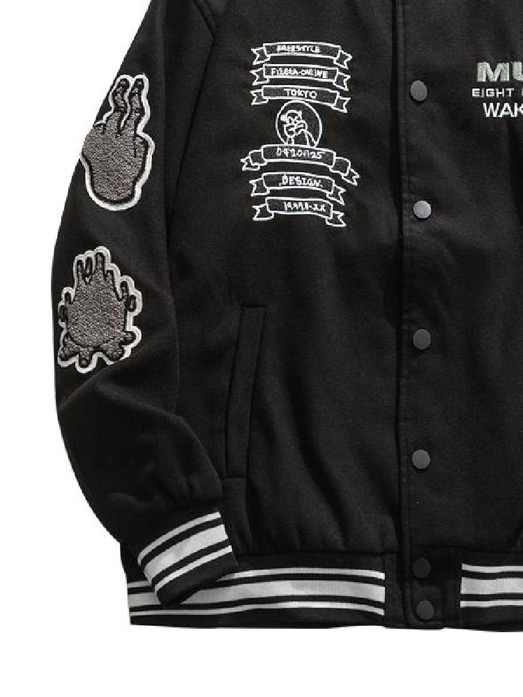 非常炫酷个性的一款夹克,袖子的毛巾绣徽章拼接设计使得美式校队风在这款暗色军装短夹克得以重新诠释,由重质羊毛混纺面料制成,确保强度和保暖性。