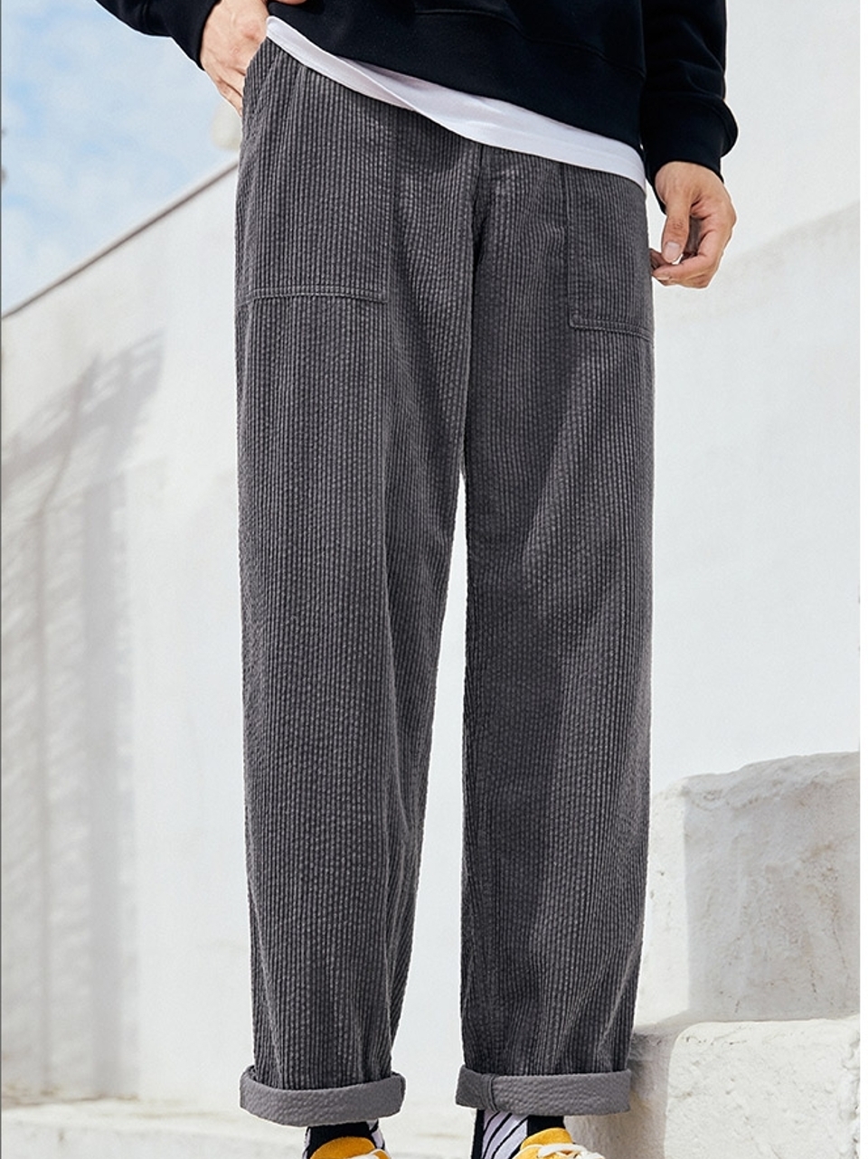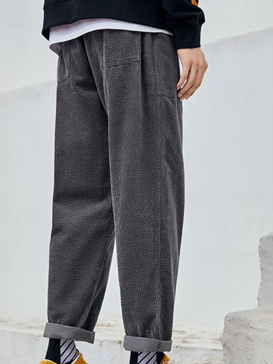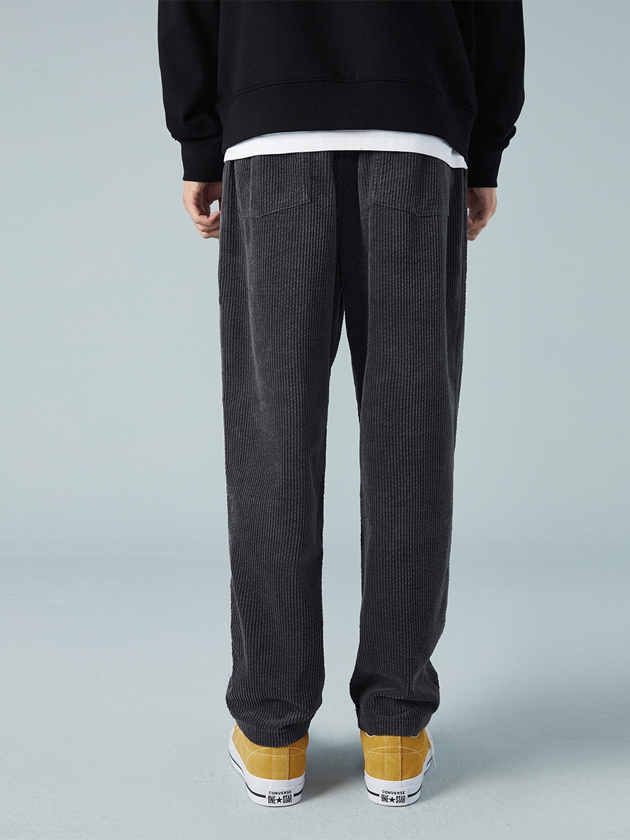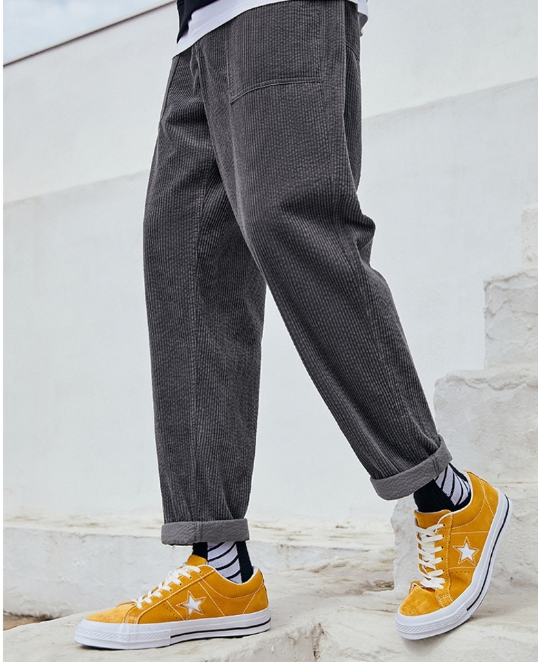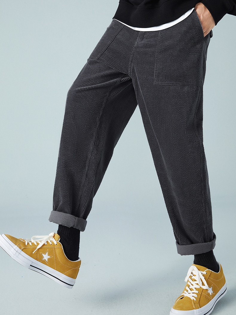 这款休闲裤灯芯绒的面料加上灰色的颜色处理更加的时髦和百搭,而且裤脚处的色差也是很不错的一个设计点。