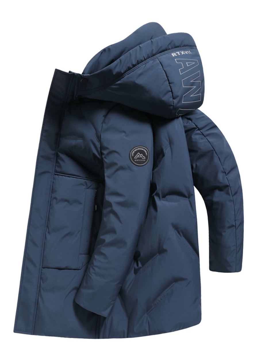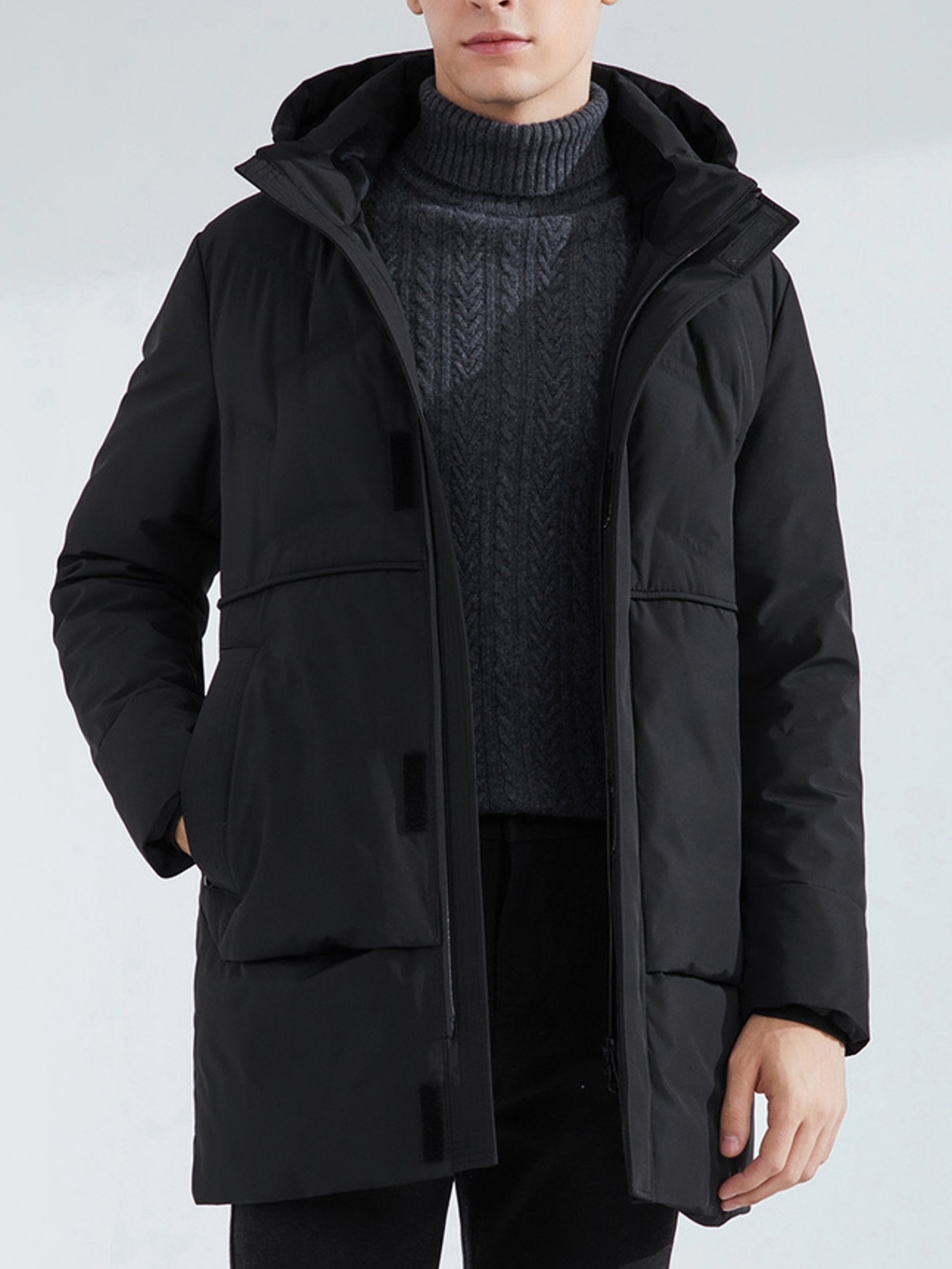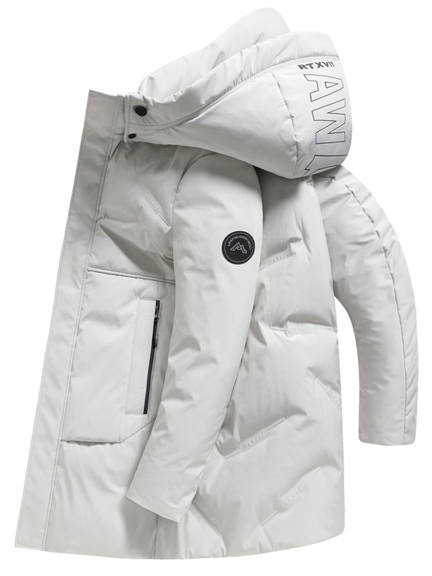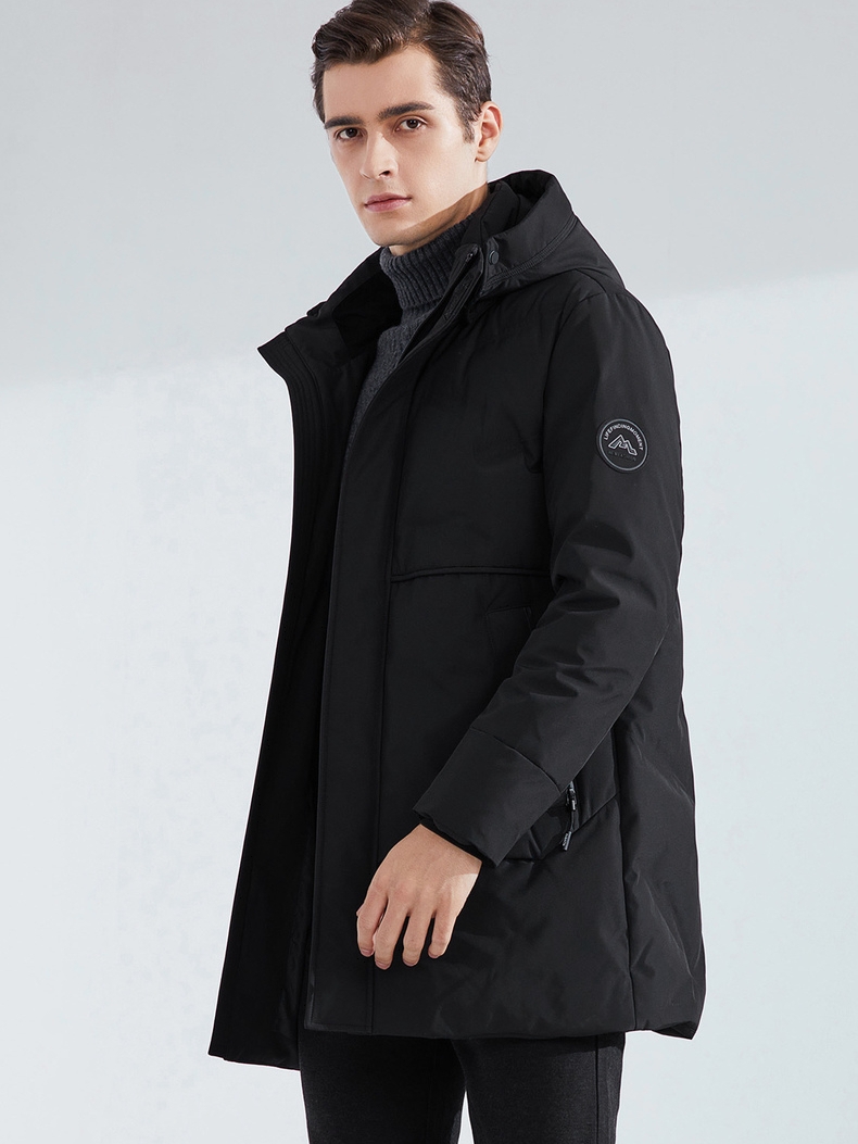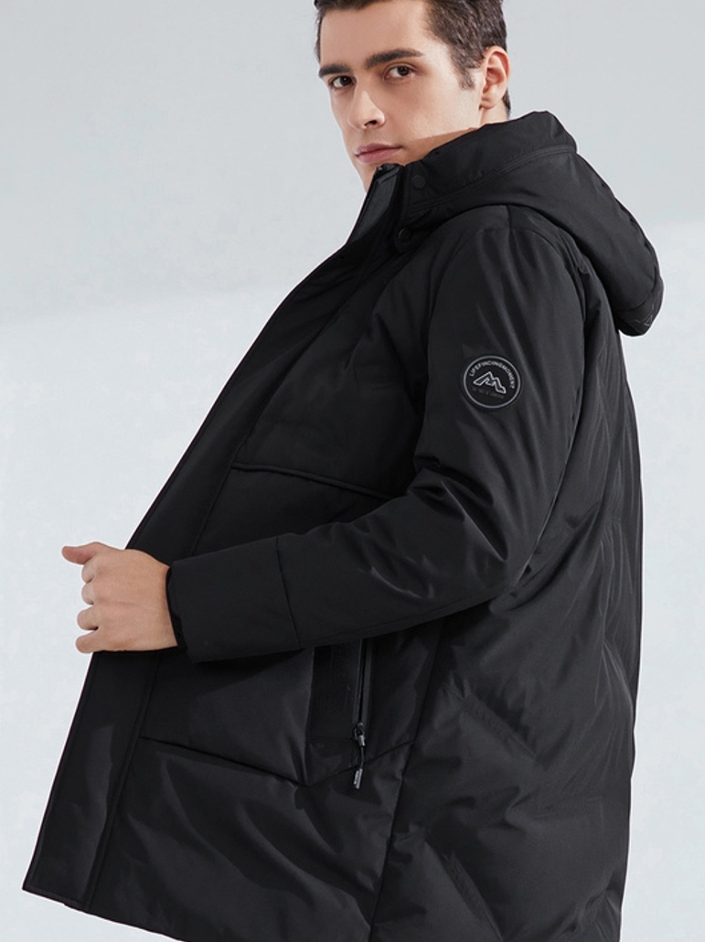 这款连帽长款羽绒服,设计亮点有不规则绗线和它的鹅绒填充物,不规则绗线具有设计感,大气简约,工艺精湛。高质量鹅绒,具有高蓬松度,无异味,均匀智能填充。