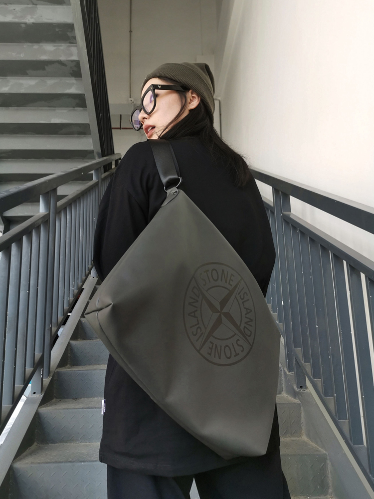 特殊皮质感的防水面料制作成斜挎包,方形和单层设计,可以容纳各种日常小物,经典的石头岛LOGO印在其中,低调又不失高街格调。