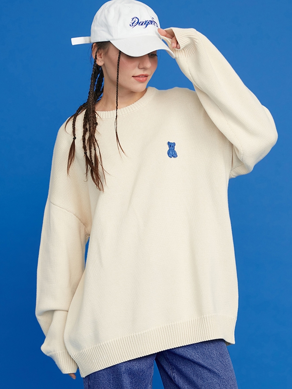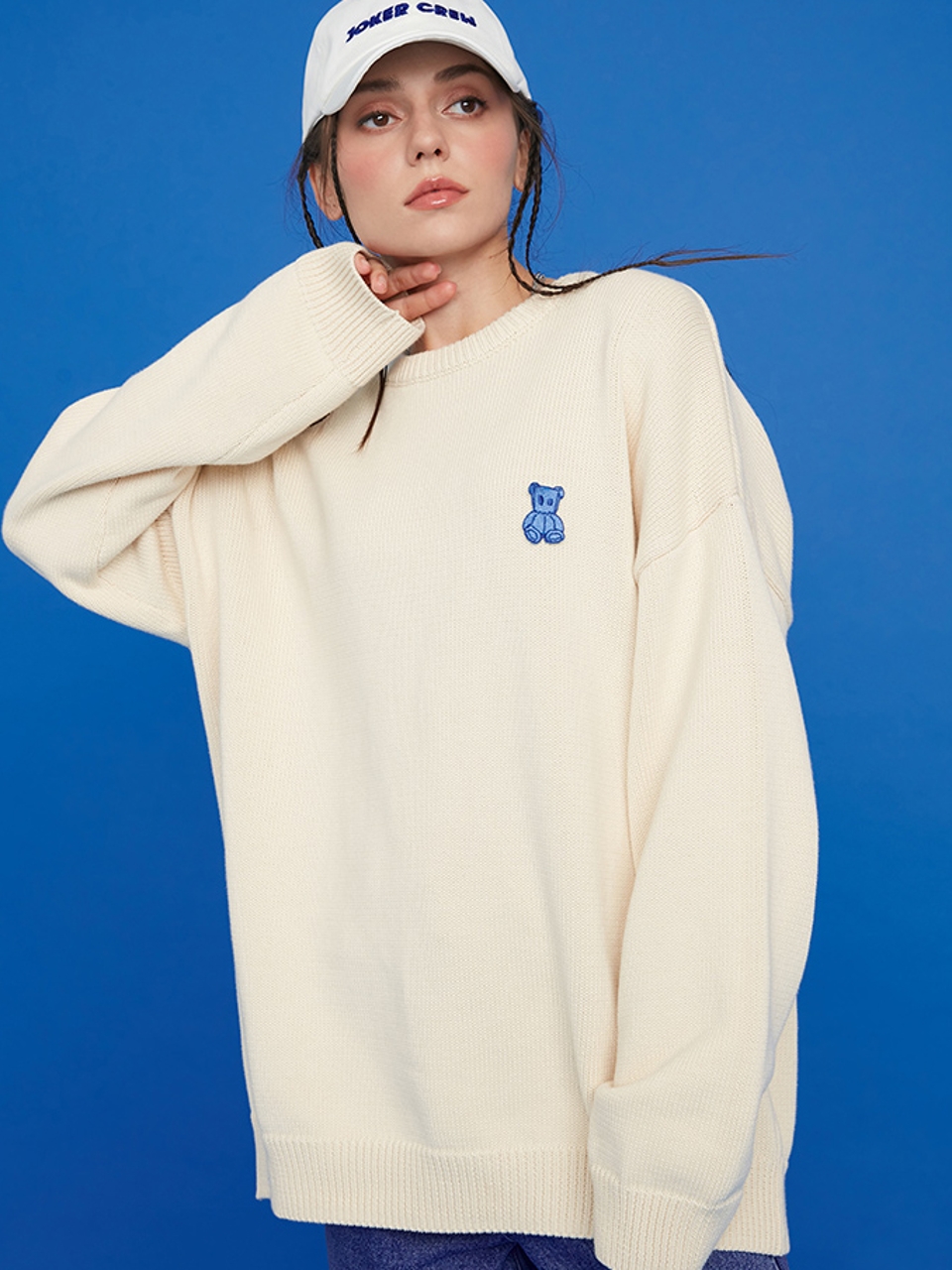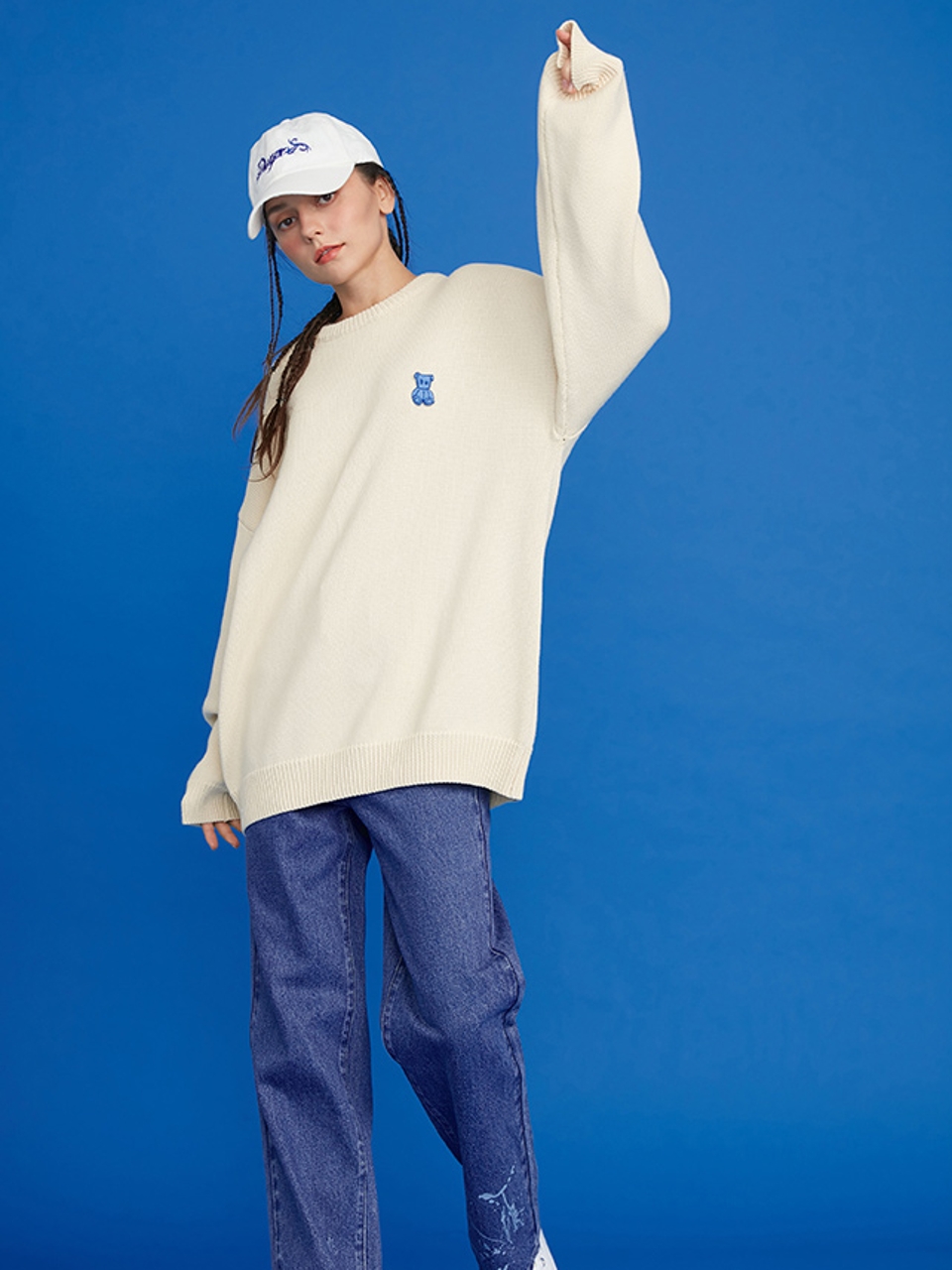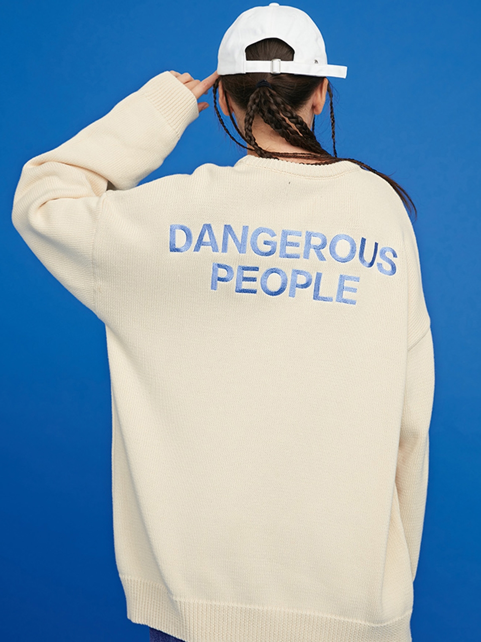 此款卫衣纯净的白色,显得干净利落,点缀上字母刺绣图案于后背,两者简约但增加其时尚感。搭配上宽松的蝙蝠袖,整件卫衣充满了随性的慵懒气场。