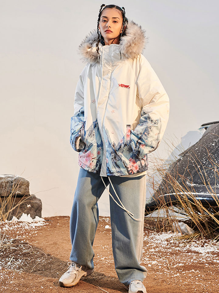 这款宽松版型的羽绒服,大面积的油画印花,让羽绒服保暖的同时也能有超个性的颜值哦。