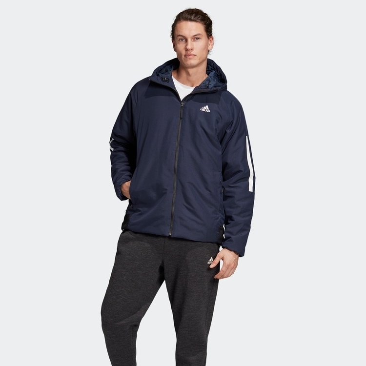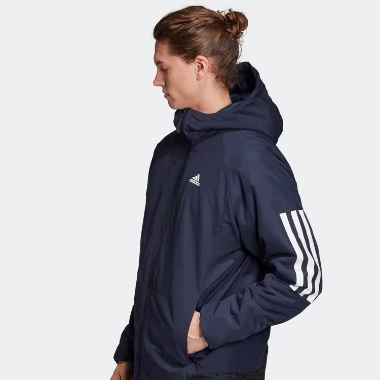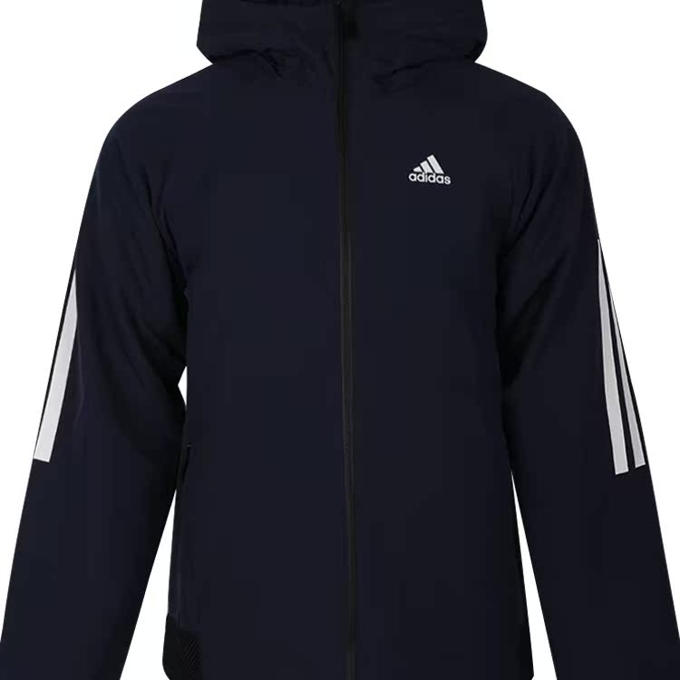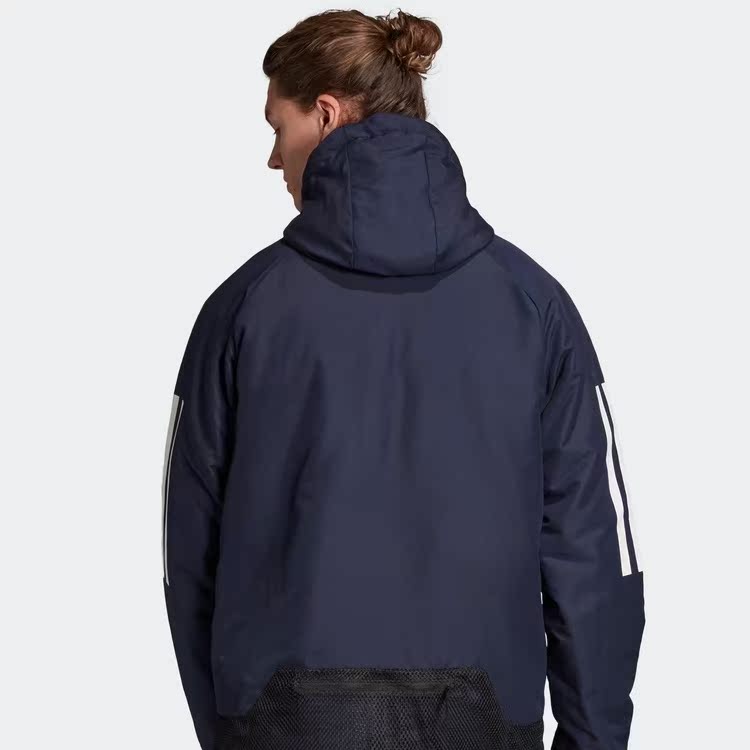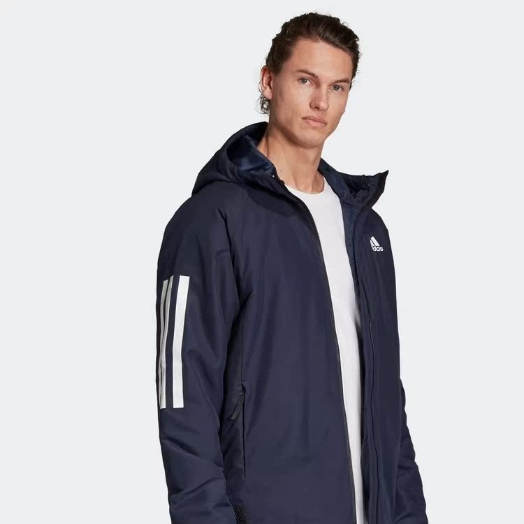 此款Adidas男士风衣,运动风十足的蓝白撞色,衣袖白色三条纹拼接,帅气连帽设计,下摆和袖口皆有松紧收口,户外运动提供防风保暖效果,内置网面层,轻薄透气,做街头无惧风雨的潮流boy。