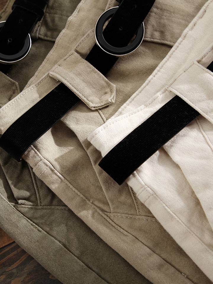 上身十分帅气的一款小脚工装裤。裤型随意舒适却不拖沓,微掉裆的剪裁很有味道。每个小设计都非常耐人寻味,特别是裤腿的可调节的魔术贴,再也不用担心!