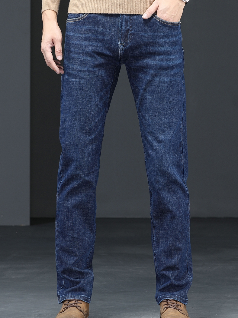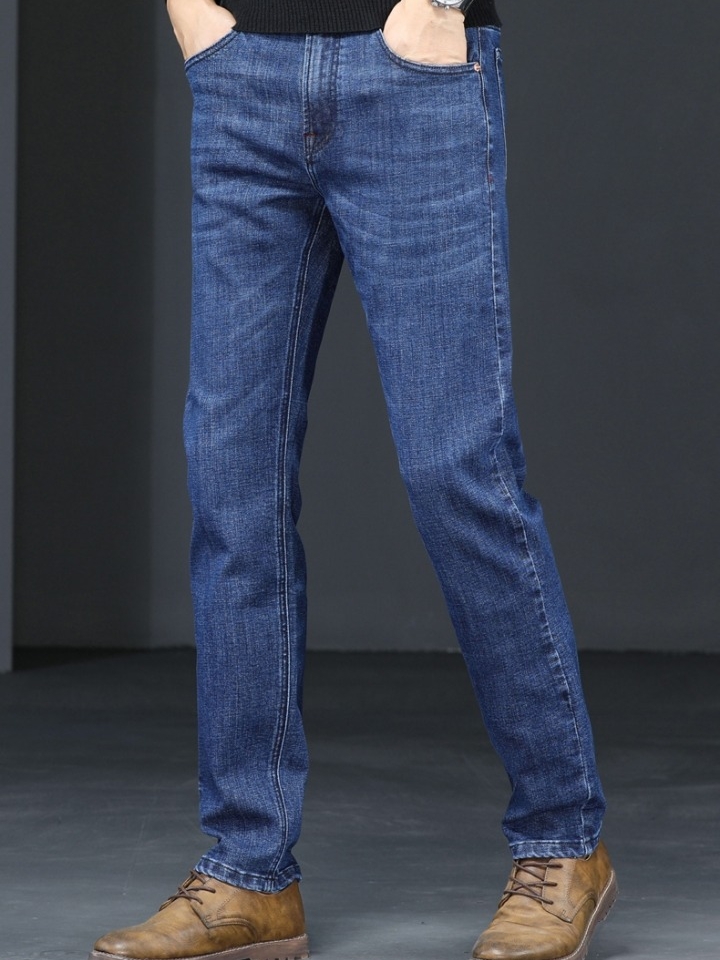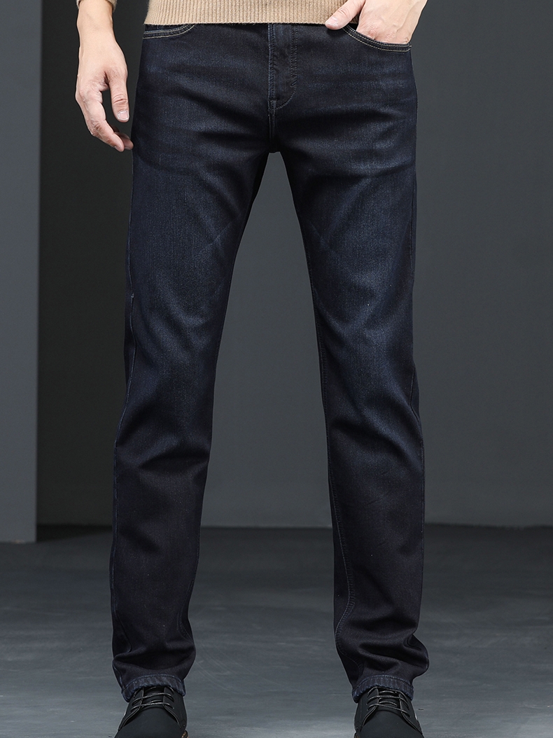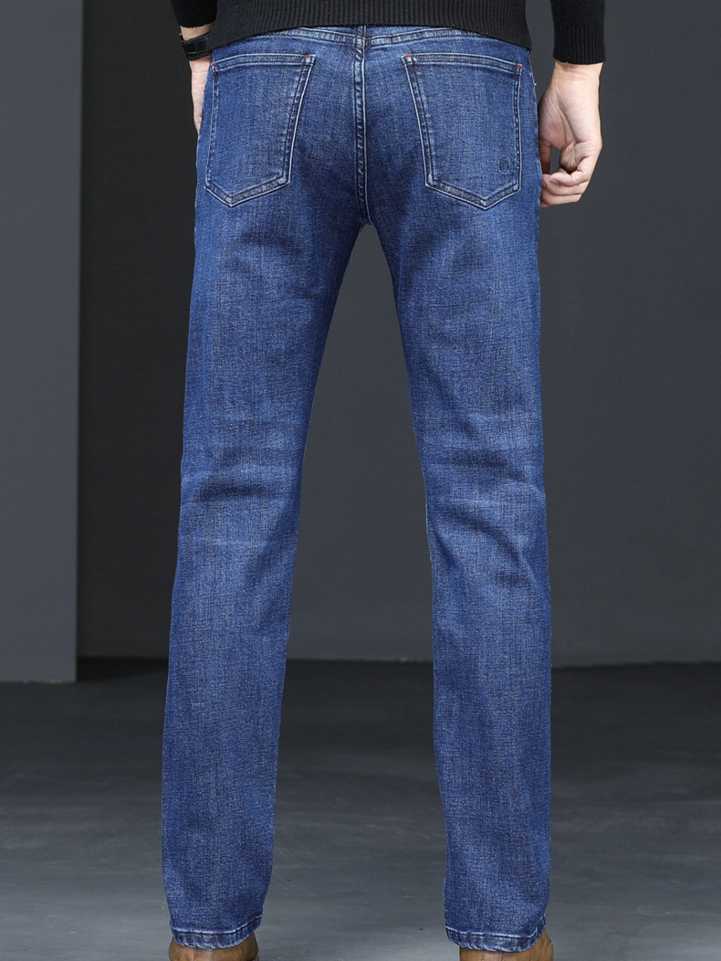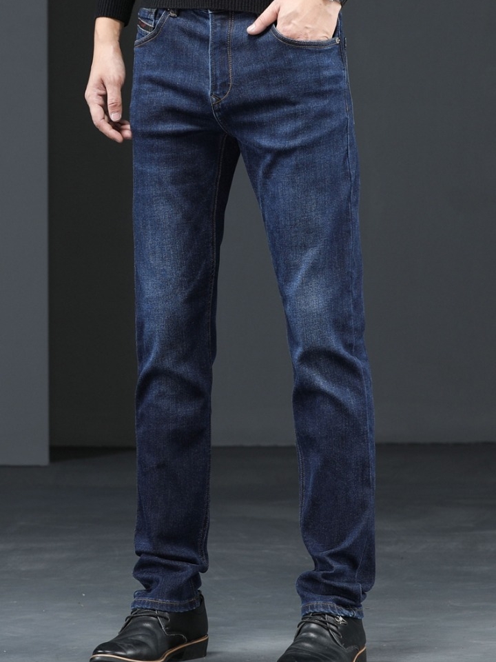 牛仔裤的面料为棉、聚酯纤维、粘胶纤维和氨纶混纺而成的牛仔布,其中,棉的含量为主,令牛仔布柔软亲肤性好,透气不闷热。