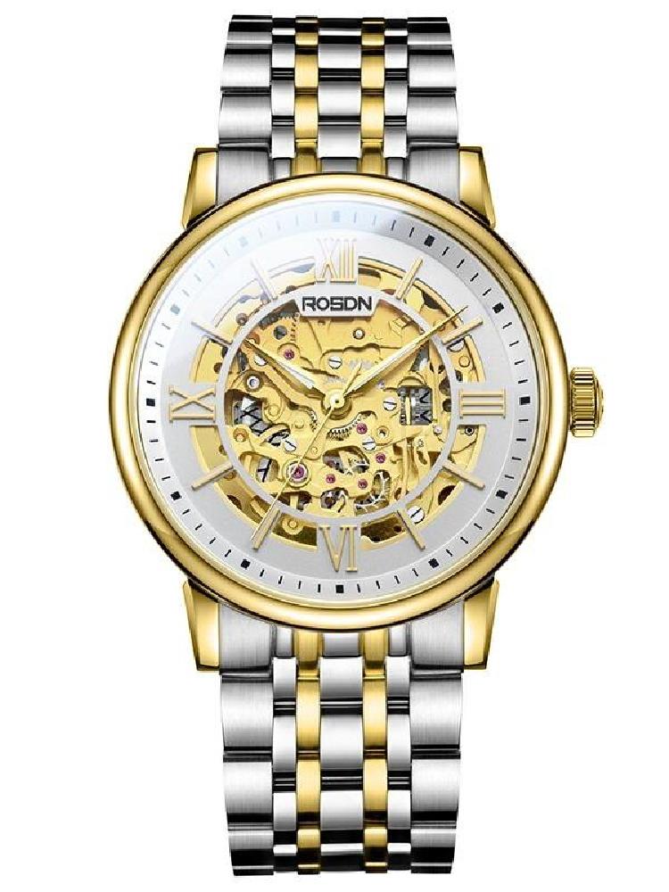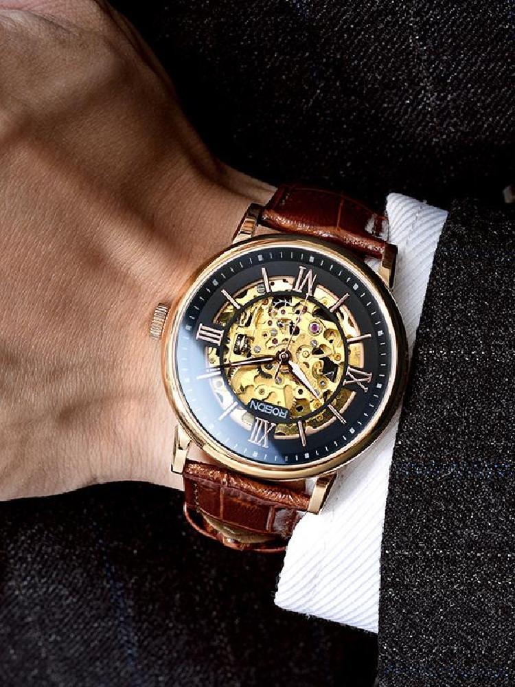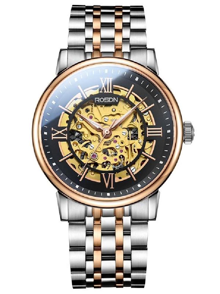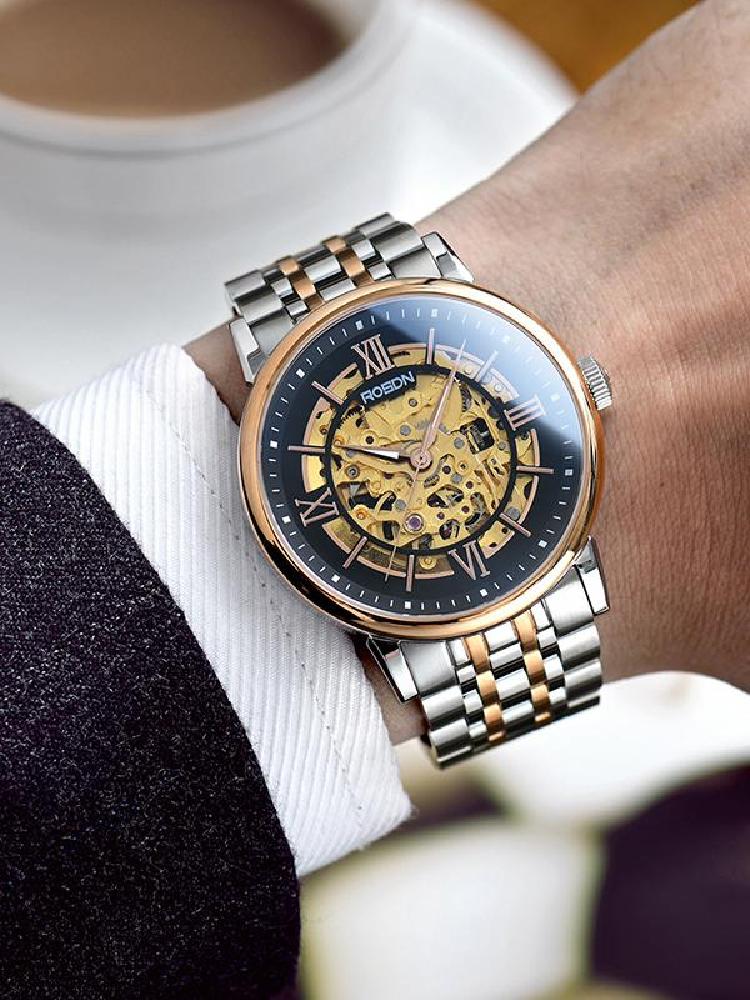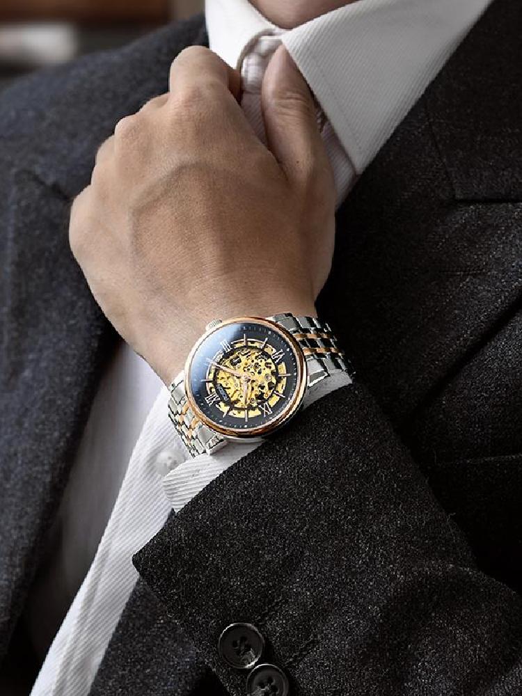 黑白配色的表盘设计,展现男士率性帅气,黄色秒针的加入更添几分时尚活力; 进口24钻全自动单历机械机芯,透视底盖设计,让你感受机械美学魅力