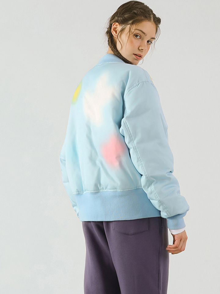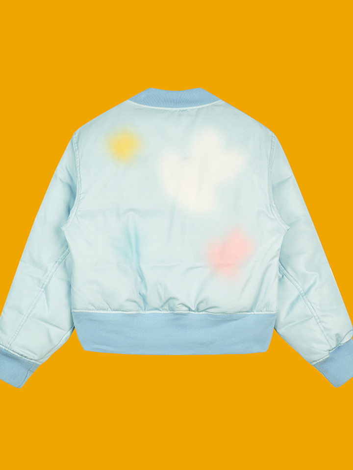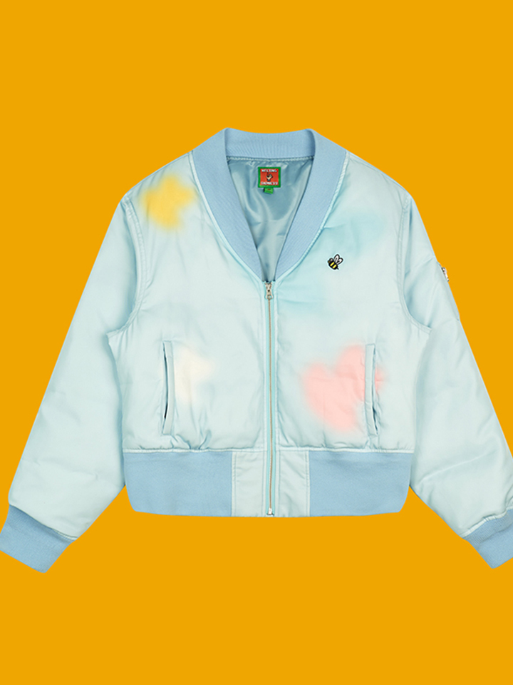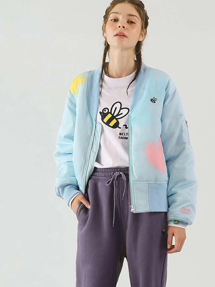 短款的夹克拉链外套采用蜜蜂刺绣,结合晕染印花。