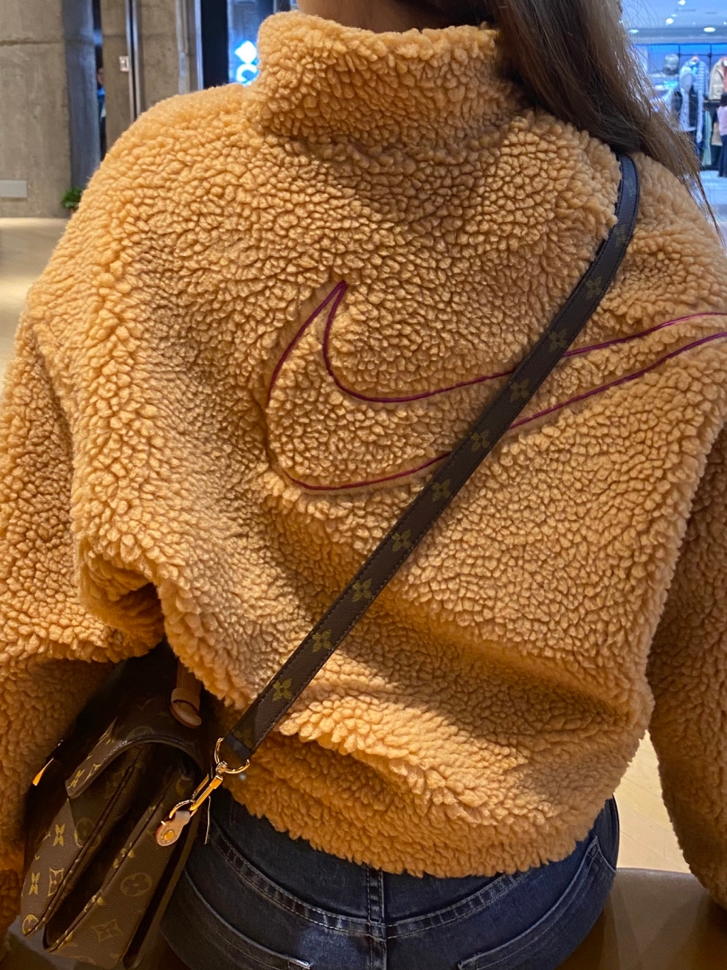 有点棒球服的味道,结合羊羔绒元素,非常帅气的走过,袖口的棉质条纹罗纹面料,衣身字母印花让整件外套都亮起来,适合总是喜欢变换风格的女生。