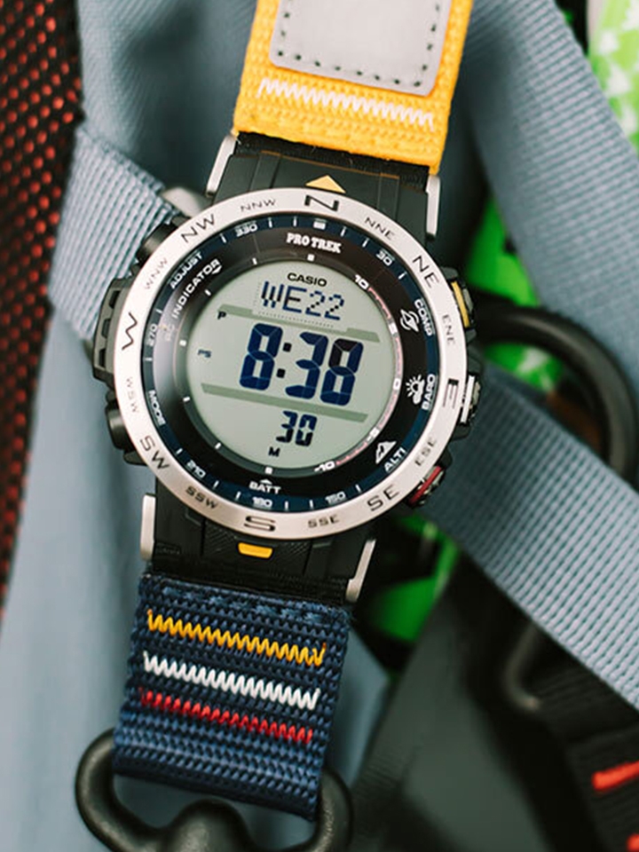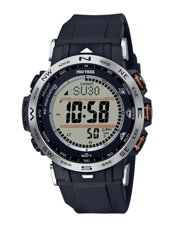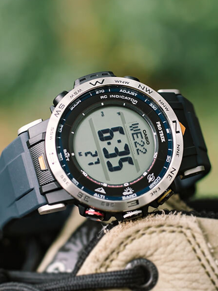 卡西欧Protrek登山系列运动男表。防刮矿物晶体表镜,更易辨别,增加可视性。采用三重感应器,六局电波,功能包括罗盘、气压、高度、温度、100M防水、太阳能,进一步减少了能量消耗并提高了测量精度。抗低温功能,可抵抗低温-10°C。钛金属表带,简约大方,方便佩戴。