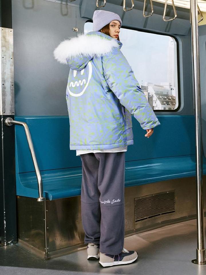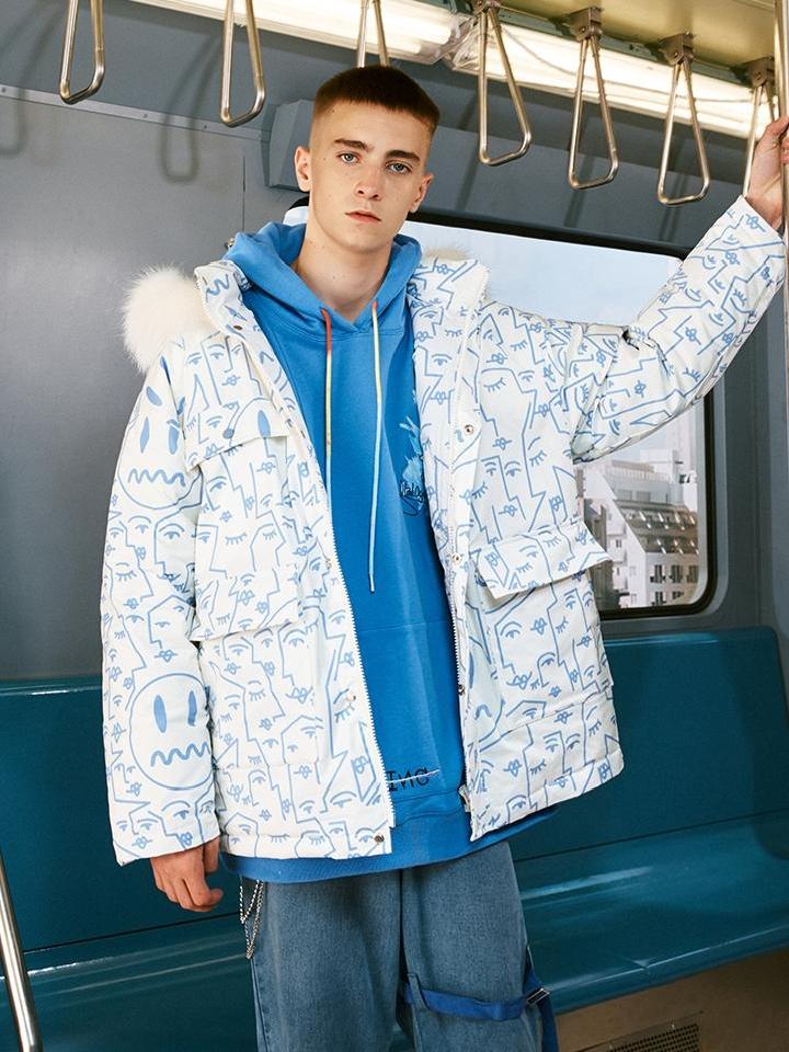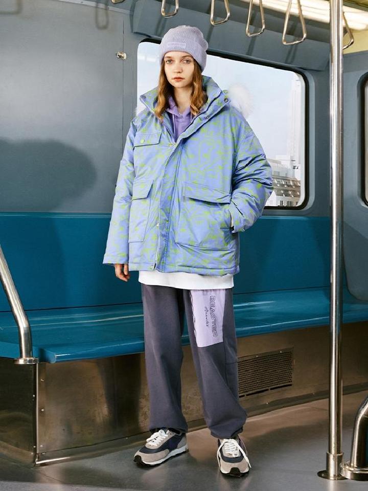 这件羽绒服外套,采用90%白鸭绒填充,轻盈挺 括。奶白色、灰紫色的冷暖色调为基础,不规则线条呈现出舒适自然的调性。