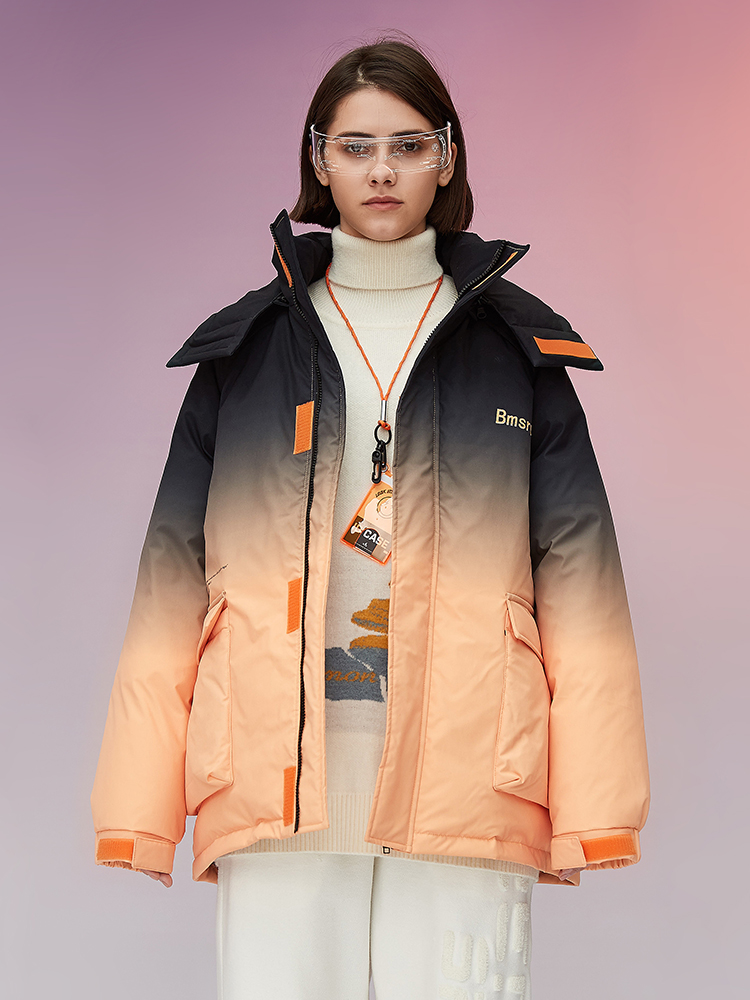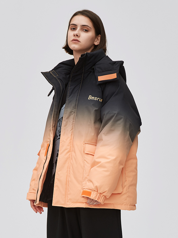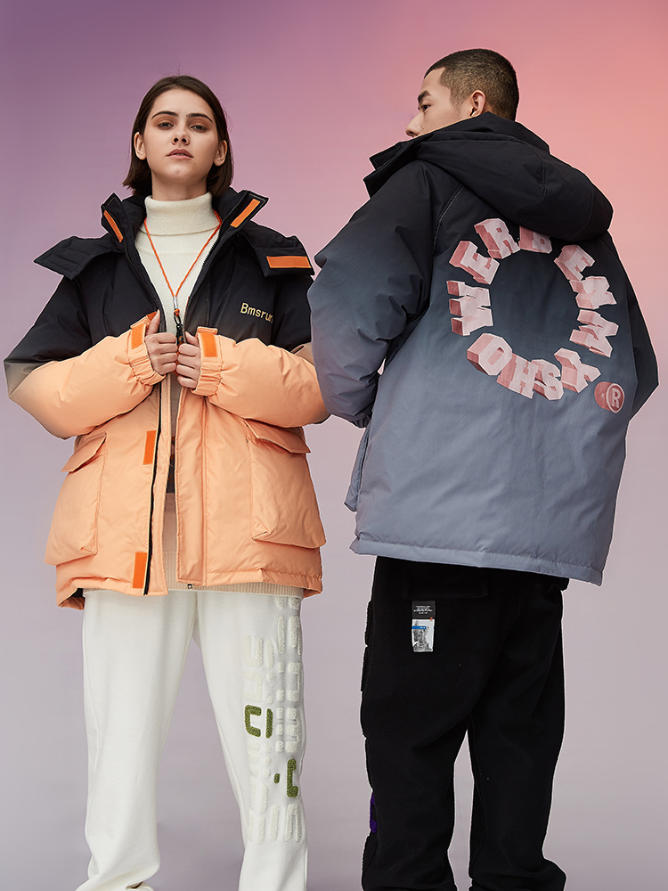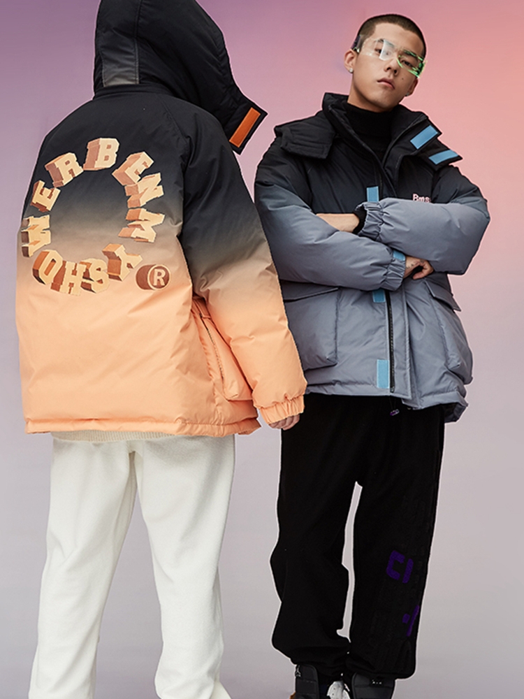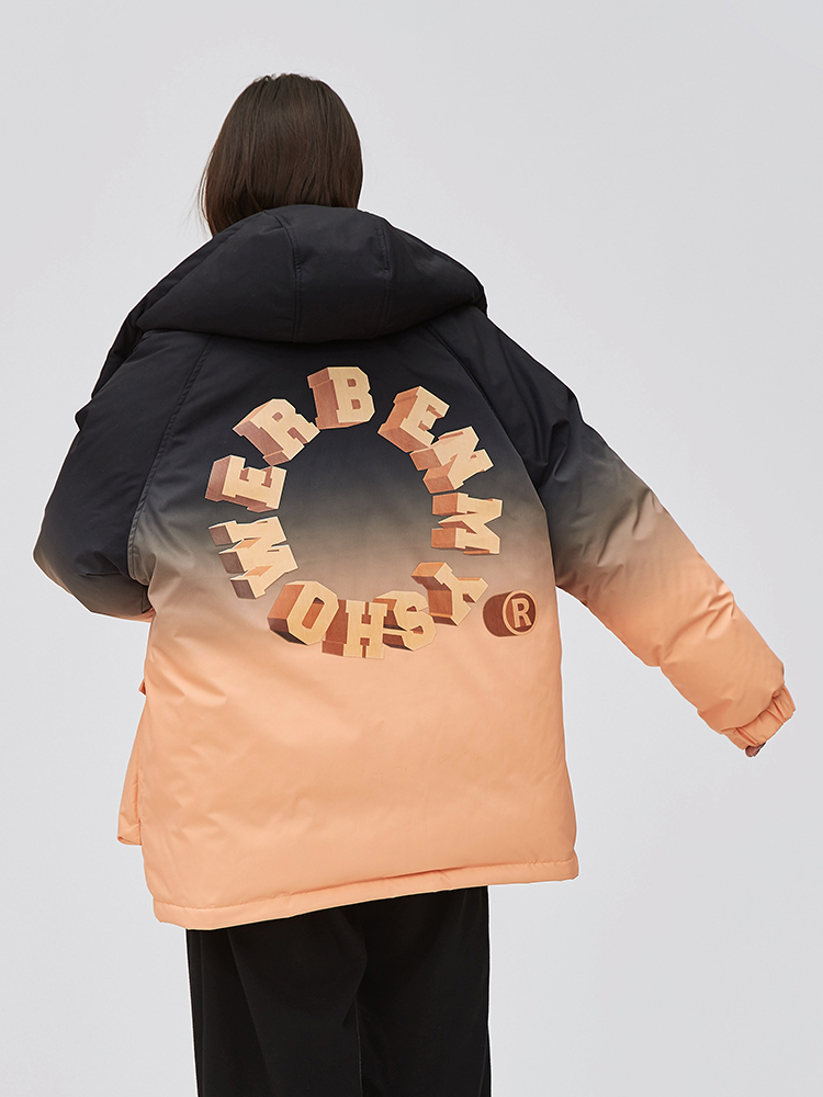 这款棉服外套有着渐变的色彩设计,展现出一种魔幻的奇趣感。背后有着圆圈型的字母印花,显得立体又生动。