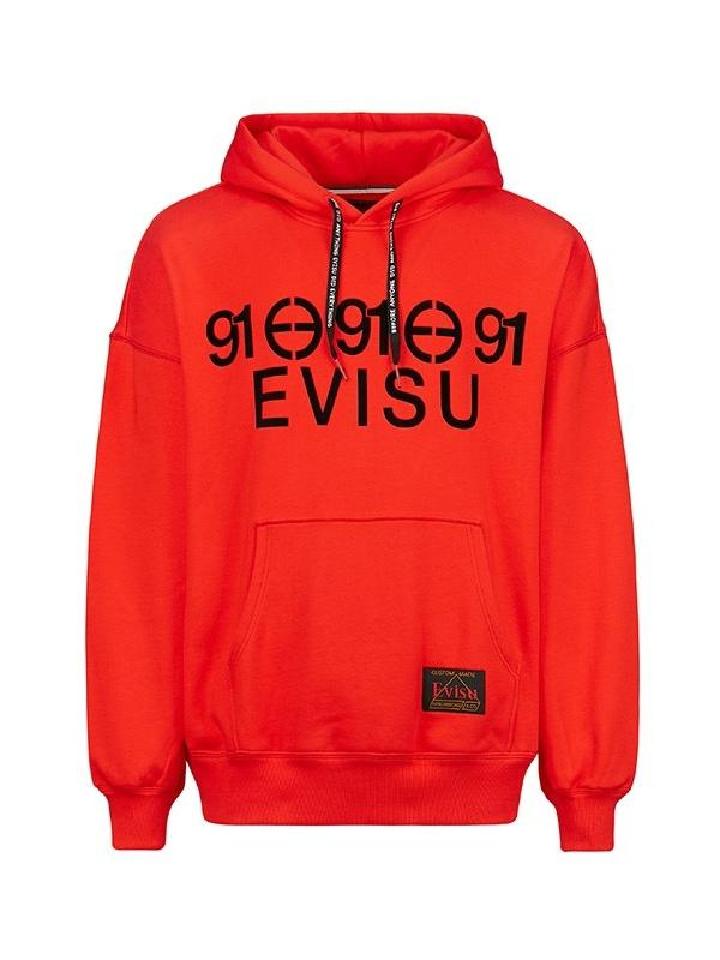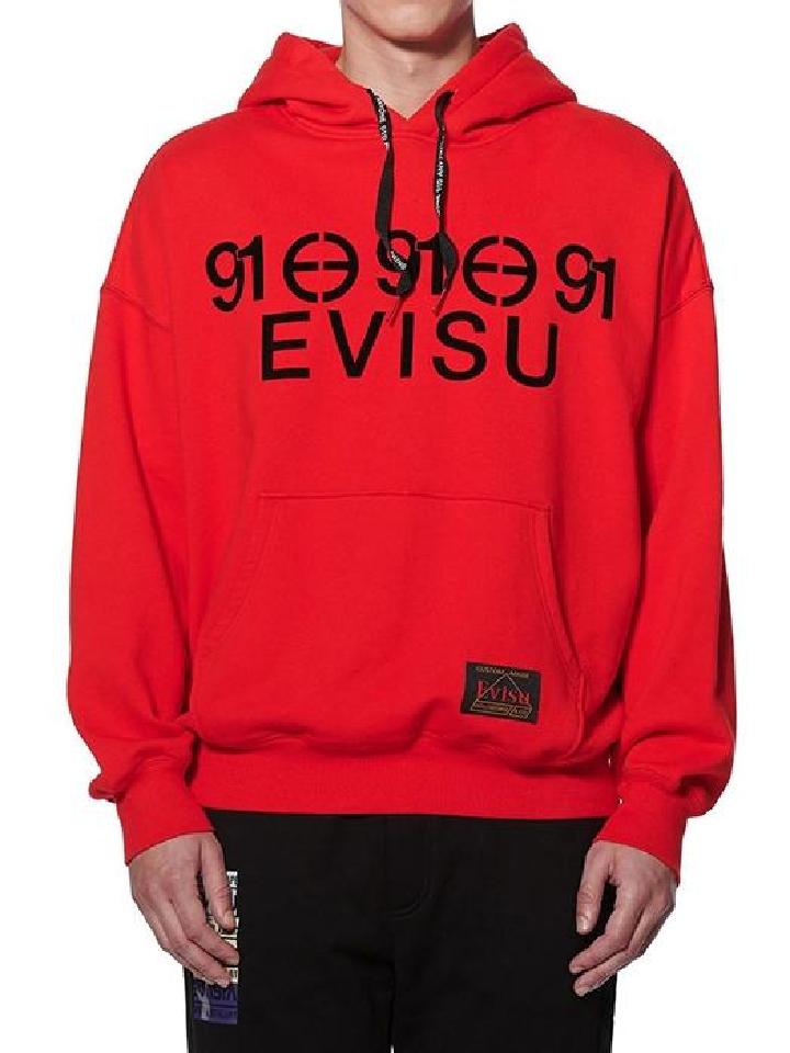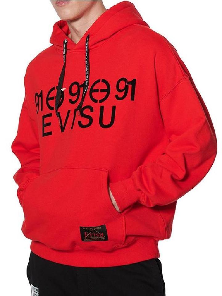 这件红色连帽卫衣正中心位置印有EVISU标志印花,并加上重复91及双E标志印花,彰显EVISU品牌型格。