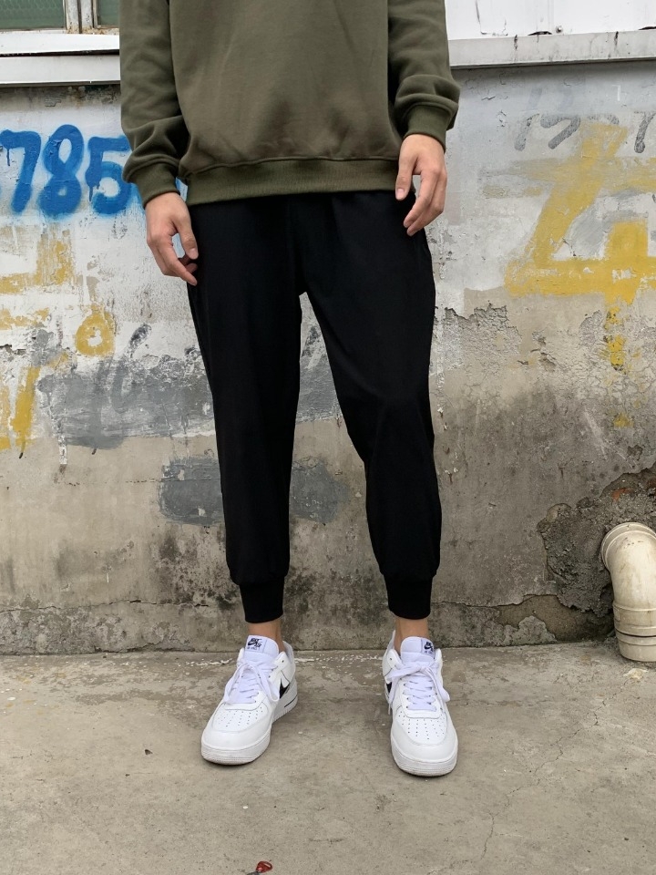 这款束脚裤,万能百搭,让你从此告别小短腿,这款裤子穿起来非常的显瘦,而且又是立体的裁剪,完美的体现你的身材,非常的凸显腿部的长度,而且还不会褪色起球,建议搭配一双复古的跑鞋,这样可以提升腿部的线条,有一种运动潮男的美感。