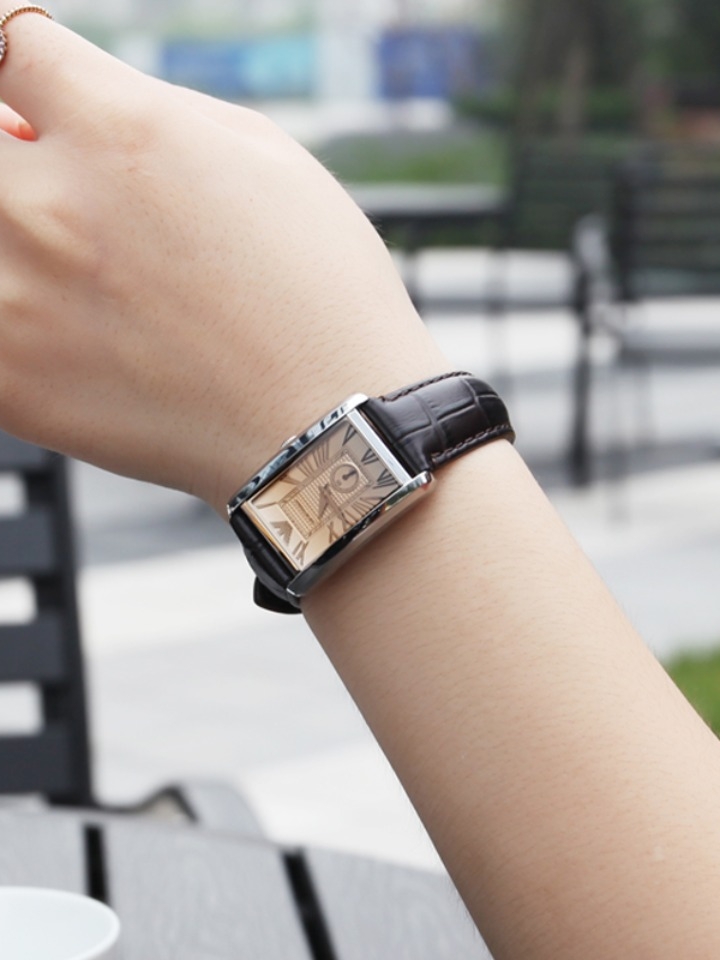 AR11067采用了新颖方盘设计,白色方形表盘搭配玫瑰金表圈,优雅格调,气质之选,而且它还有灵动指针设计,纤细指针,简洁刻度,彰显灵动之美,同时它的表冠廓形流畅,贴合舒适,圆润而细腻。