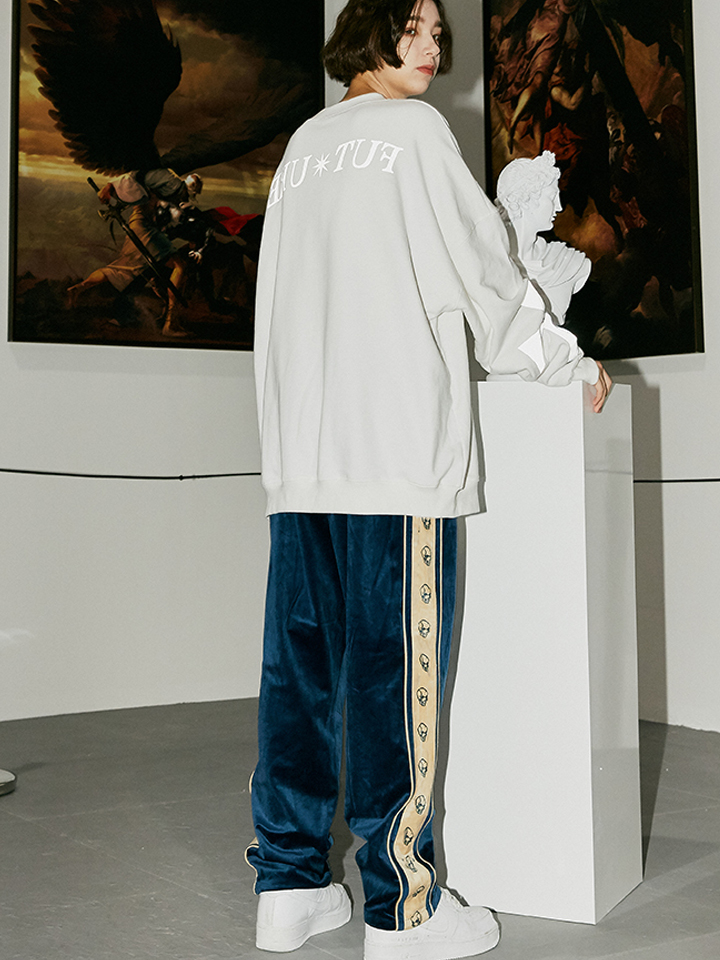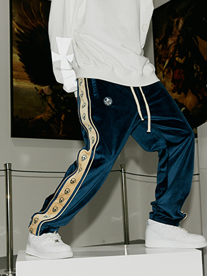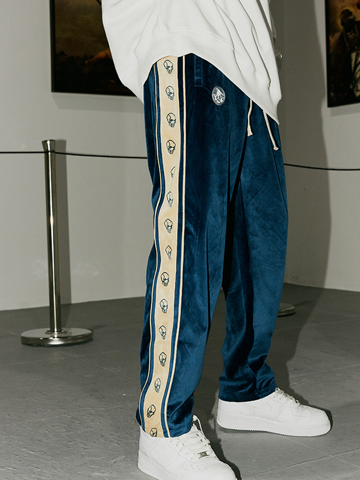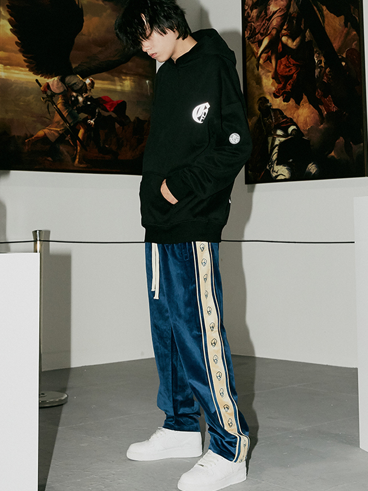 裤缝出采用骷髅串标设计,彰显了对称设计的美感。宽松的版式裁剪,上身凸显独特街头气质。