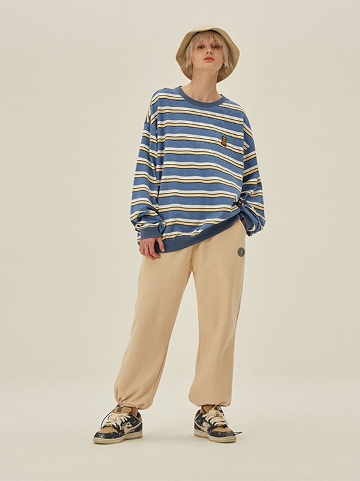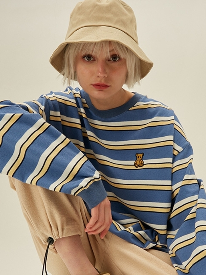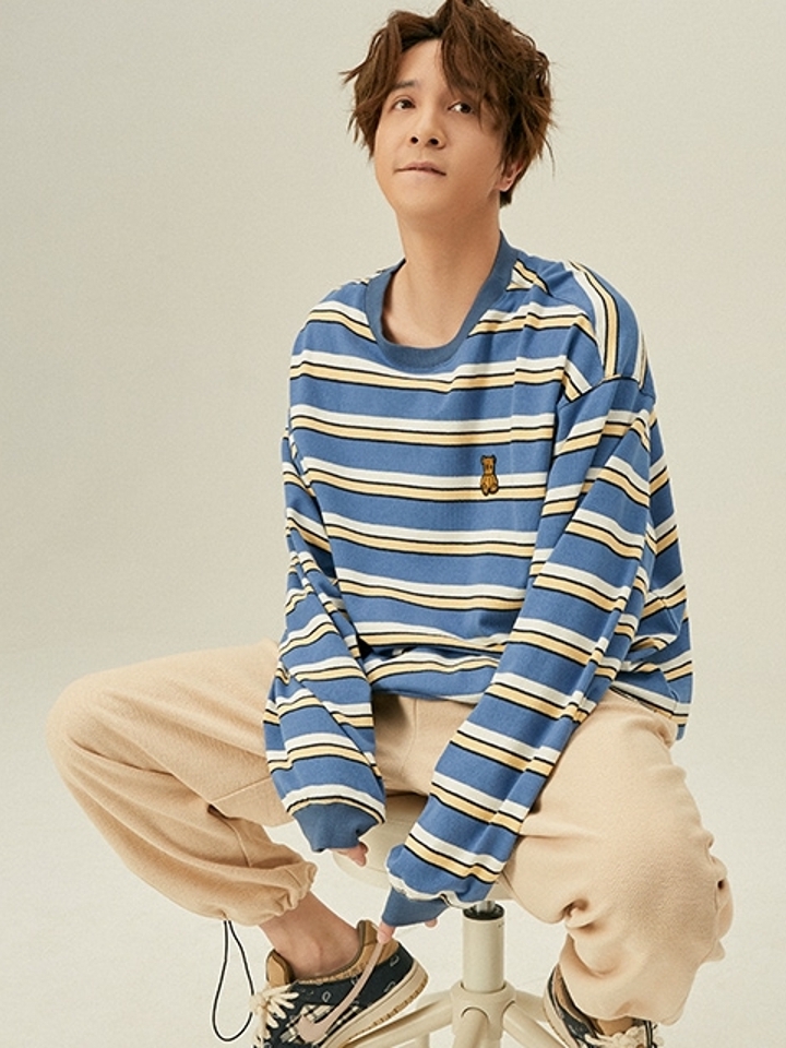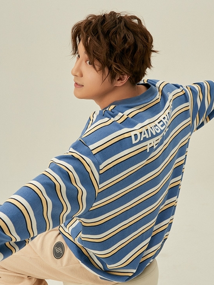衣身运用经典条纹元素呈现,穿着更显活泼与青春。柔软的面料,穿着更加舒适。亮点在于纸袋人图案的印花装饰,寓意引人遐想,视觉上点亮了整体造型。