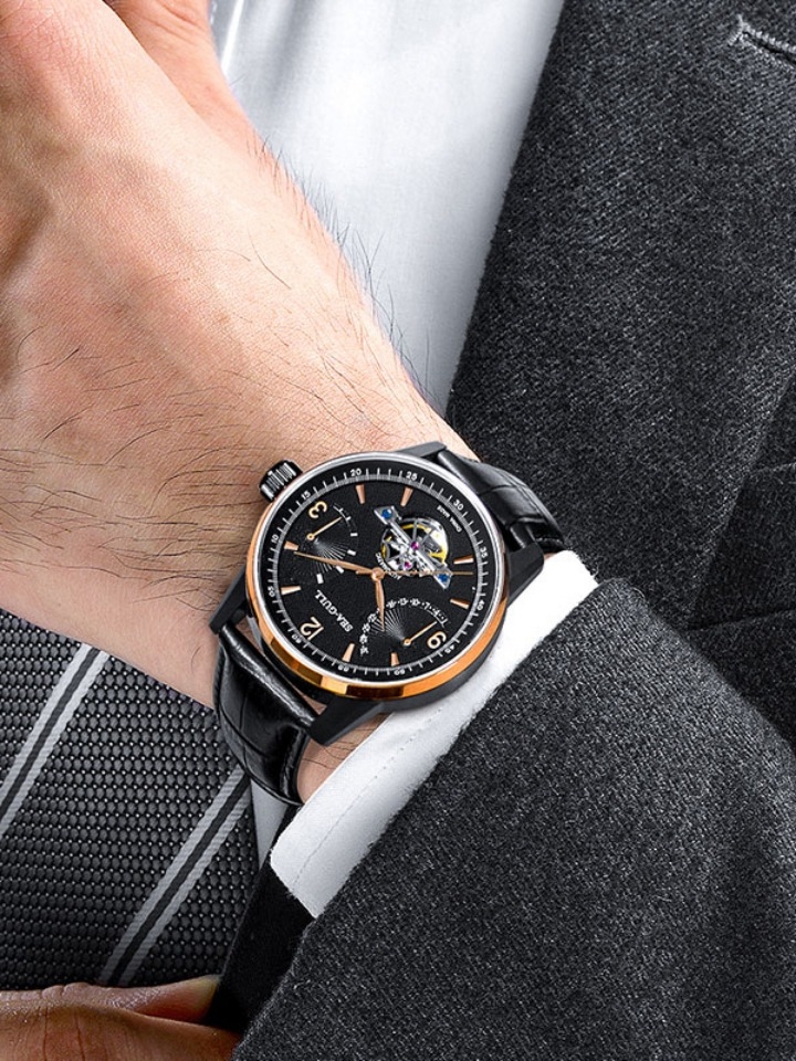 表面上精致而富有质感的机械表面独具特色,纹路交错的牛皮革表带给予手表以尤佳的光泽度。送给心爱的他一款气质简约的手表吧!