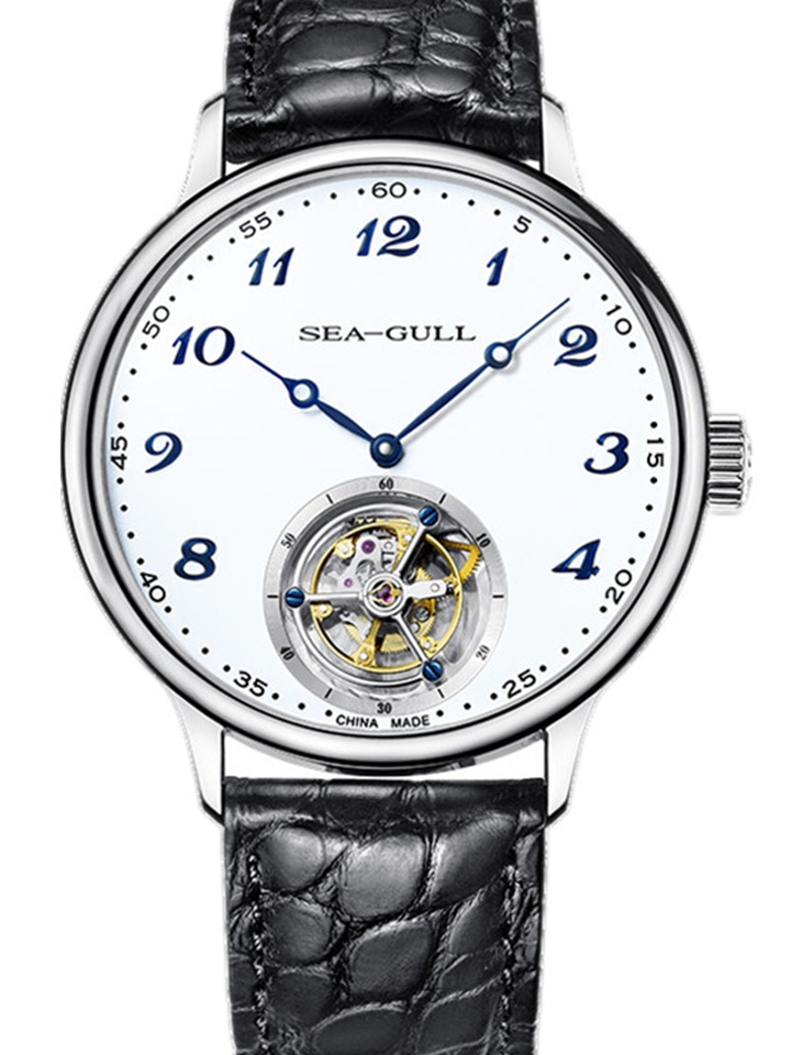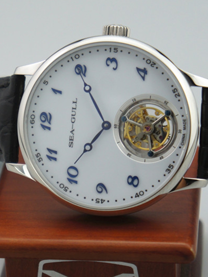 海鸥牌手表始创于1955年,至今已有60多年的发展历史。这款手表采集极简的搪瓷表盘设计,煅烧蓝指针搭配六点位置同轴无卡度陀飞轮镂空机芯。