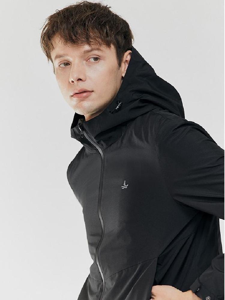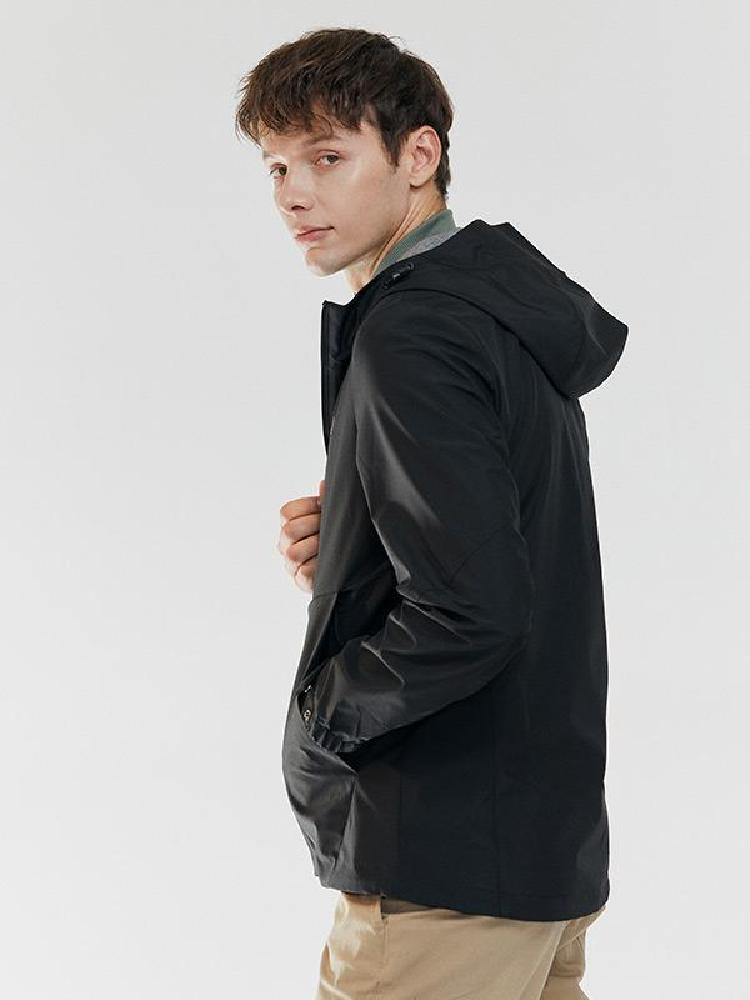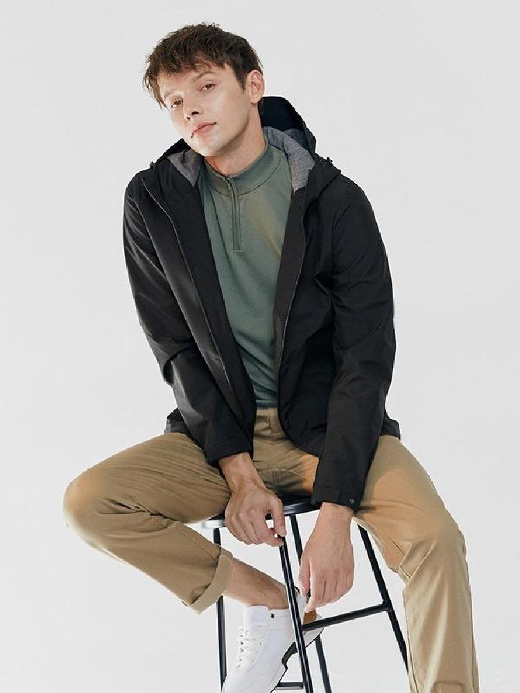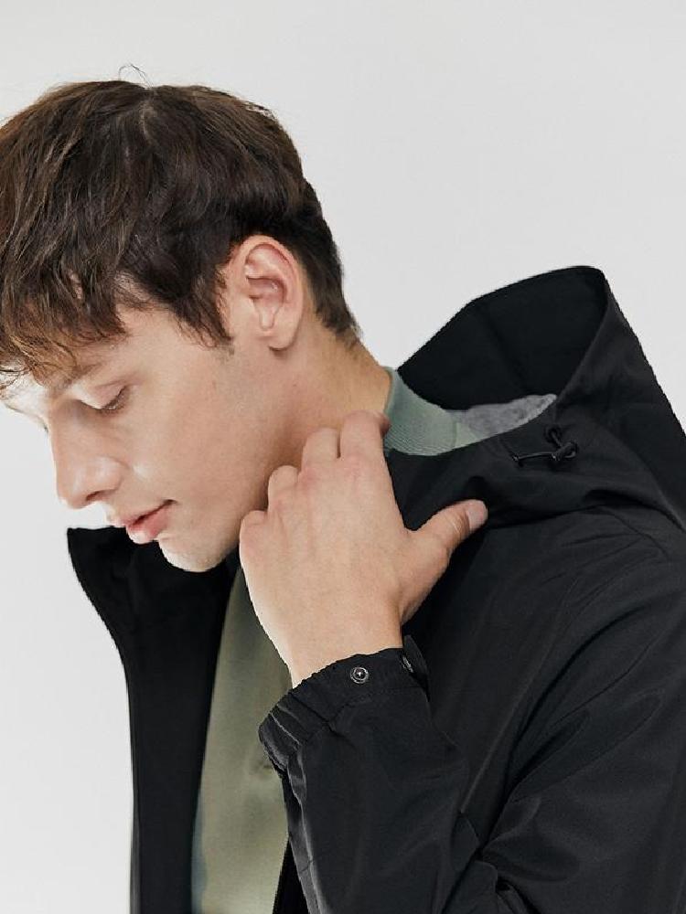 此款夹克在面料上选用了新型聚酯纤维制作而成,具备了较高的强度与抗皱能力,增强挺括感;运用连帽半开襟的版型设计,袖口采用橡筋作收束处理,休闲舒适,颇具几分运动型格;前胸以横向拉链点缀,与背部活页剪裁相映成趣,丰富整体层次效果,打破纯黑色调的枯燥与沉闷。