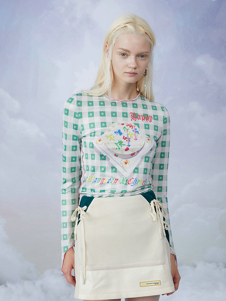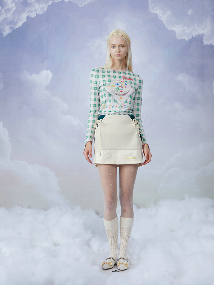 撞色格子,十分清新;衣身印花,甜美搞怪。