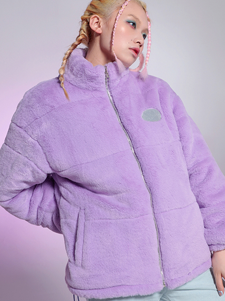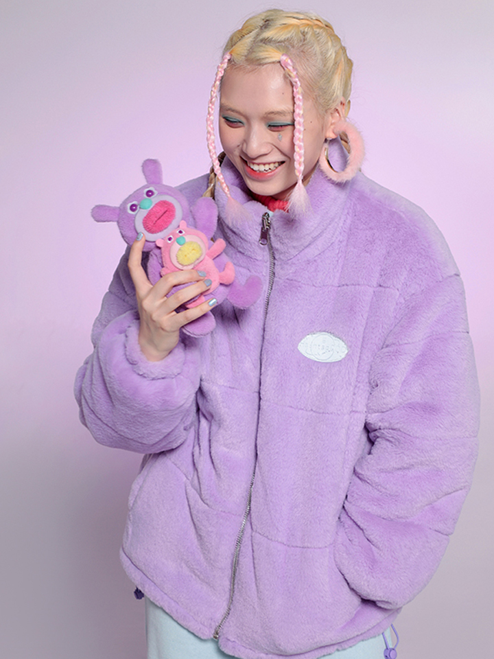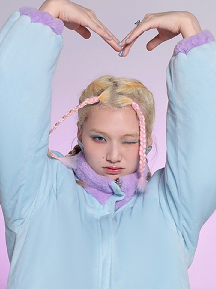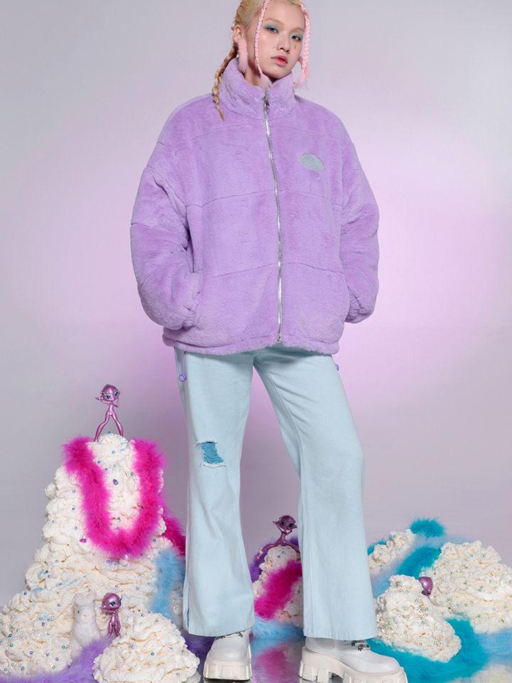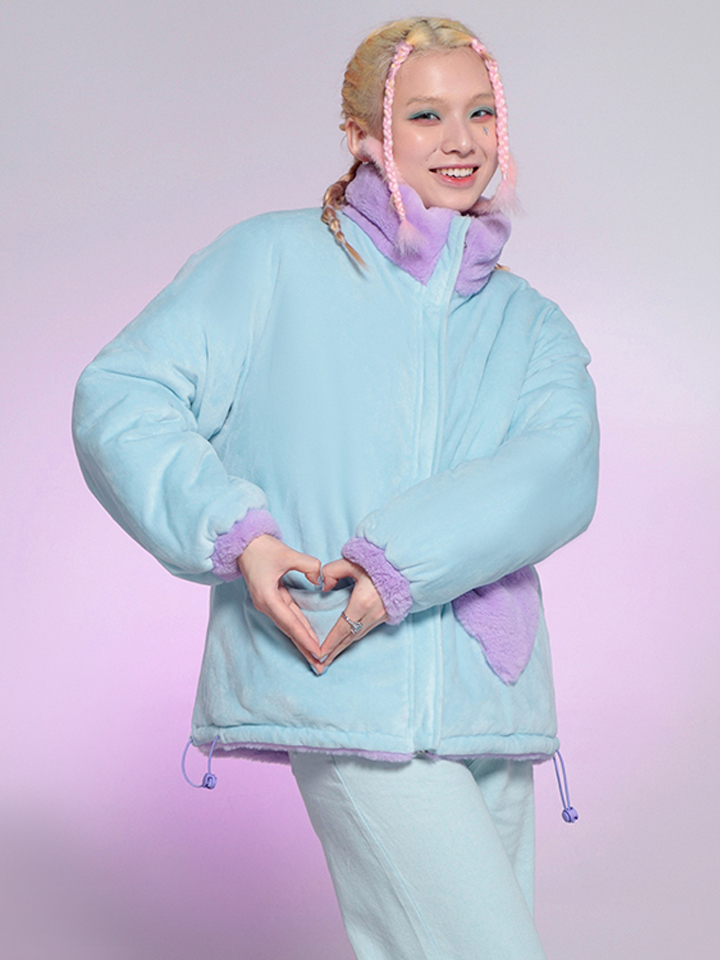 双面可穿的毛绒外套,紫色和浅蓝色撞色,清新少女风