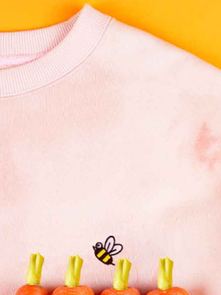 粉色的长袖T恤前面加以精美的蜜蜂印花,尽显时尚休闲风。