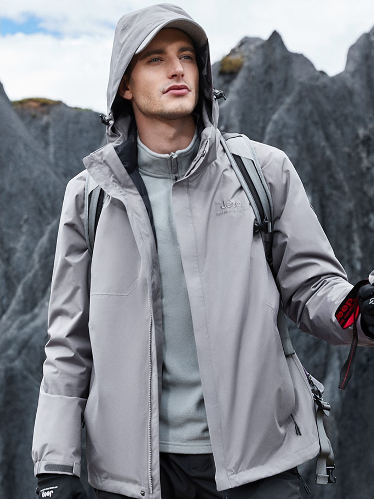 此款三合一防风衣采用NANUK科技面料,透气性强,柔软舒适,户外加长帽檐,整身接缝全压胶防水面料,不惧户外恶劣天气。立领设计搭载抽绳可拆卸风帽,上身立体挺括,提供较好的穿着体验。连帽的设计,可调节抽绳,满足日常不时之需。暗扣袖口,可随心调节袖口松紧度,舒适贴合。可调节抽绳下摆,防止冷风灌入,方便实用。贴心的拉链口袋,方便存放小物品,贴心又省心。