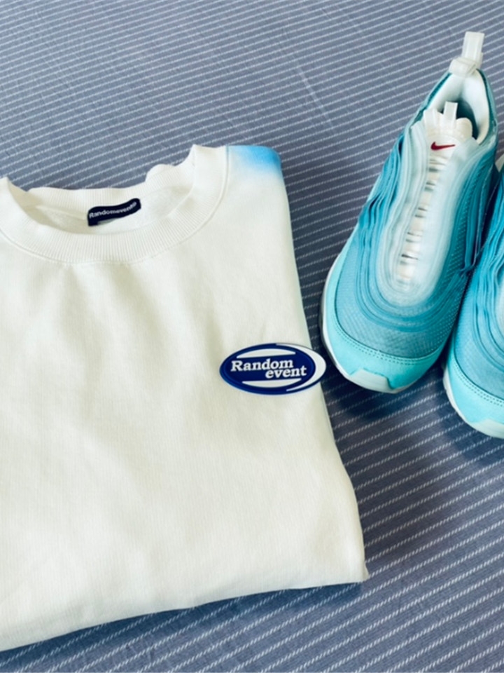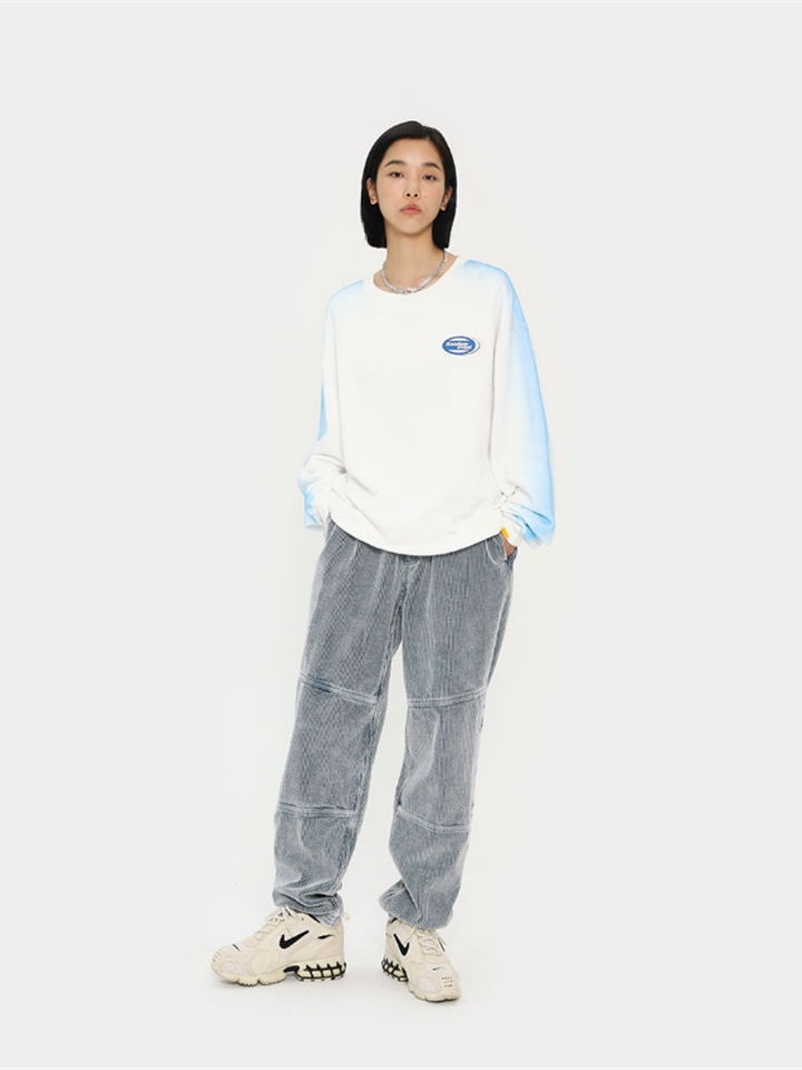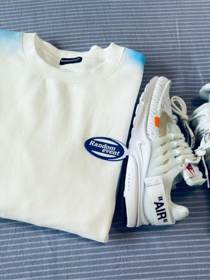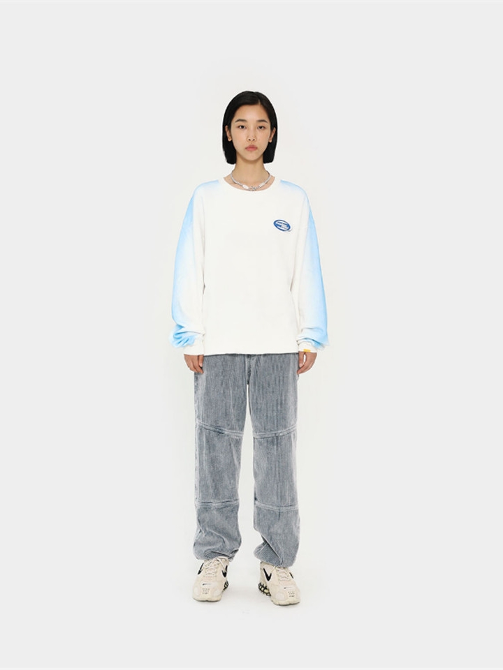 这款圆领套头卫衣。衣服表面呈现出创意独到的炸裂式晕染效果,并将胸前的撞色字母图案尽情突显出来。