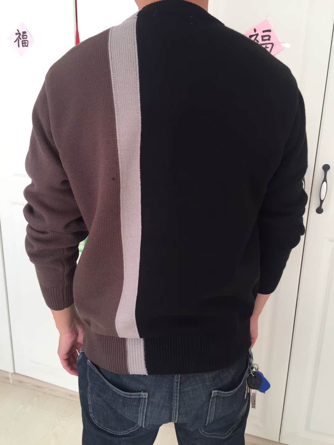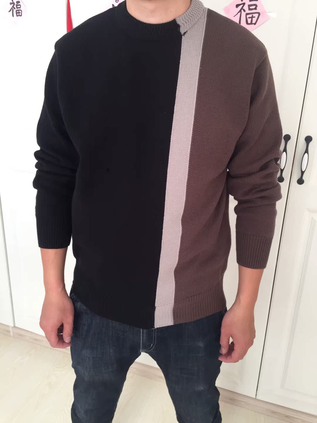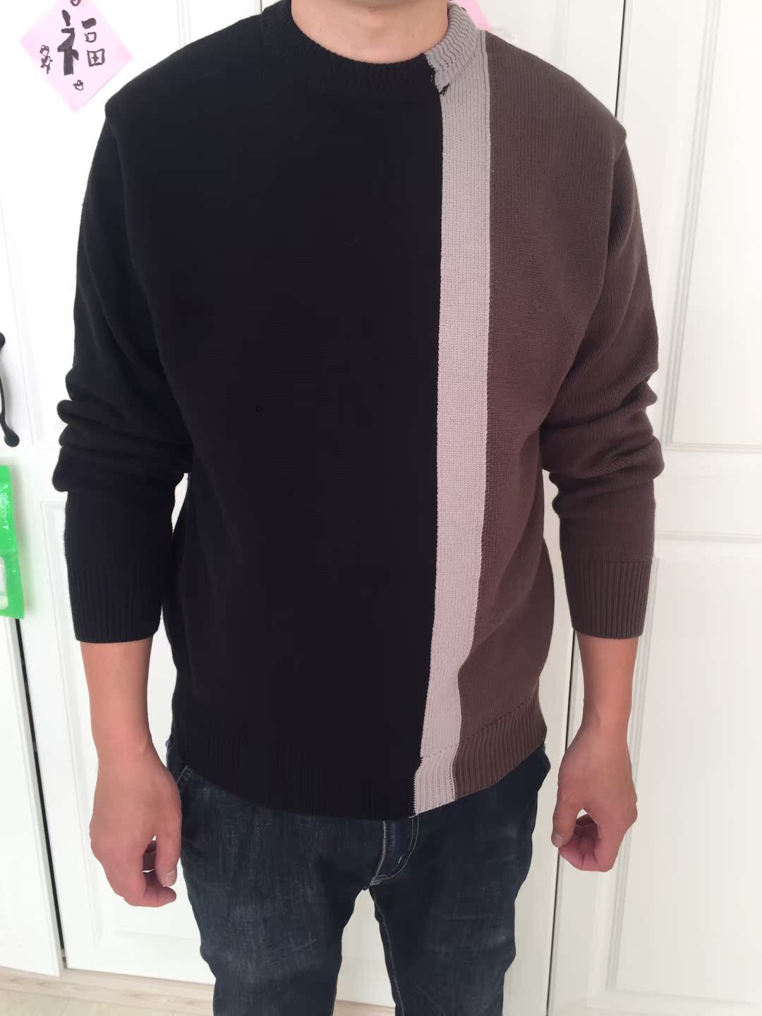 拼色针织衫,色彩柔和自然,上身衬托白皙肤色,彰显清新的感觉,显得十分温柔。下身穿着一条黑色牛仔裤,不规则的裤脚和破洞的元素,丰富整体细节,展现街头的潮流个性。脚踩一双毛绒鞋拖,打造轻松自在的穿着体验。