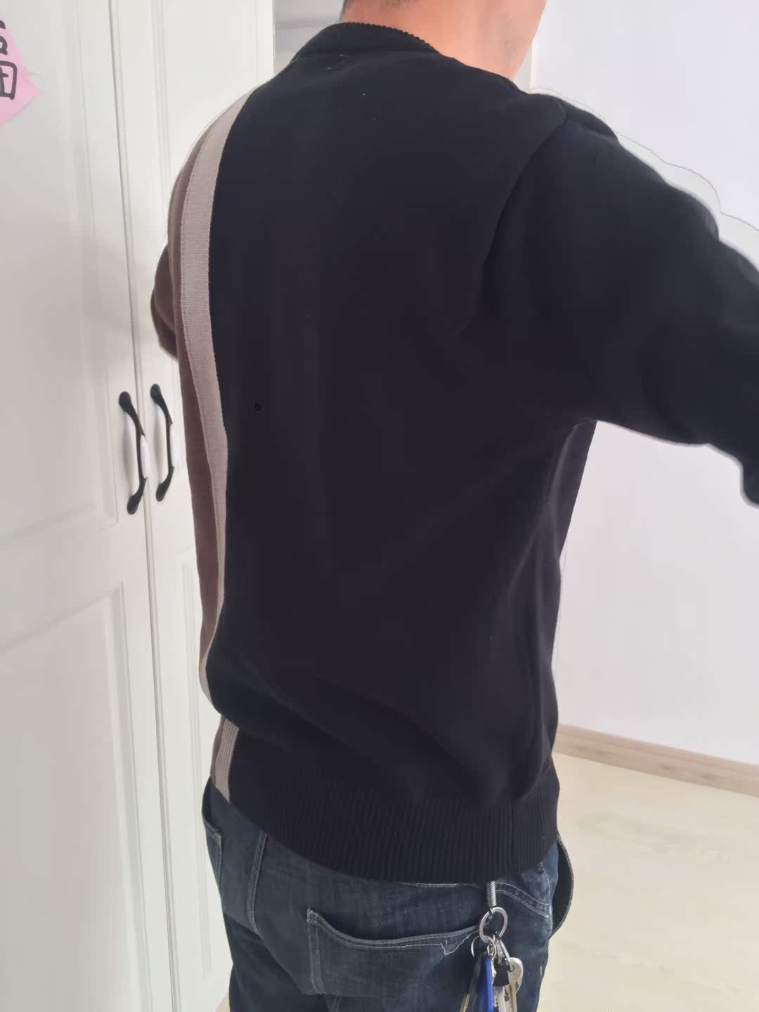 这件圆领毛衣,颈部的大小经过反复测试,很好的贴合颈部肌肤,还有效的修饰了颈部和脸部线条。毛衣的面料爽滑舒适,轻柔亲肤,适合贴身穿。双肩还有撞色的点缀,增添衣服的层次感。