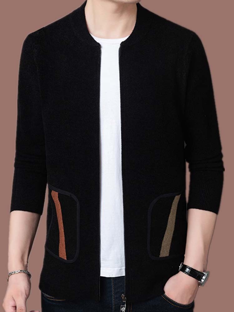 非常帅气有型的一款针织开衫,以黑色为主调,上身显瘦又百搭。内搭件白色T恤,下搭件休闲裤或是牛仔裤,整体的造型时尚大方。
