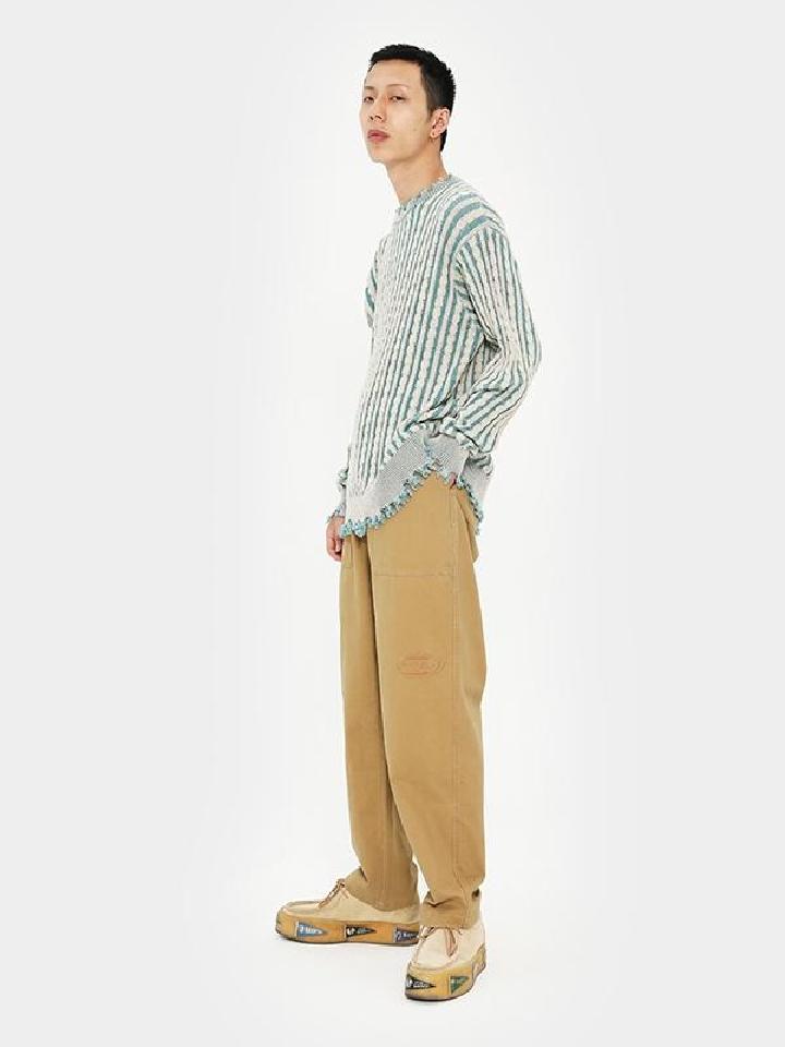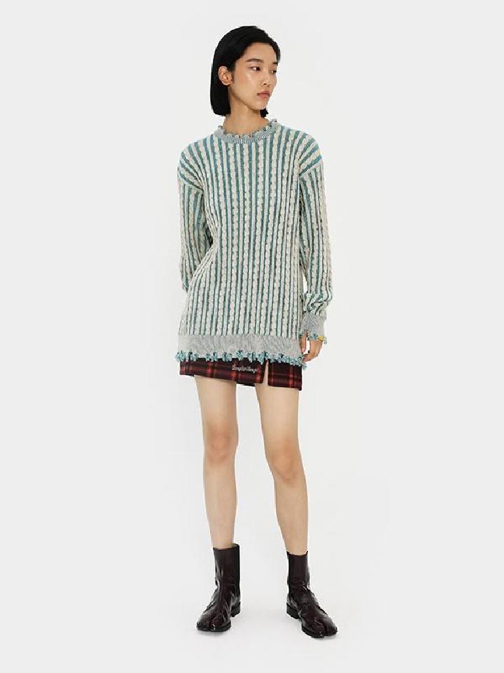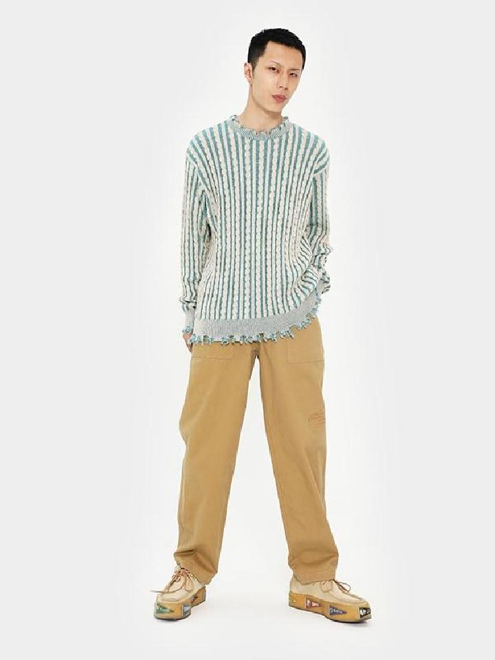 真没想到毛衣还能这样玩,采用非常个性的拼接设计,显得酷潮十足,加上拼接边缘采用磨破设计更显得个性。