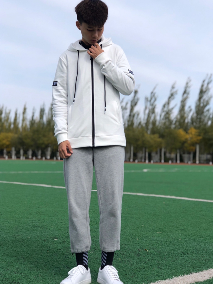 清爽卫衣搭配休闲裤和运动鞋,青春活力十足。