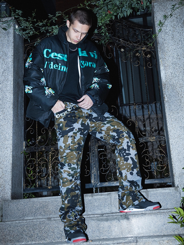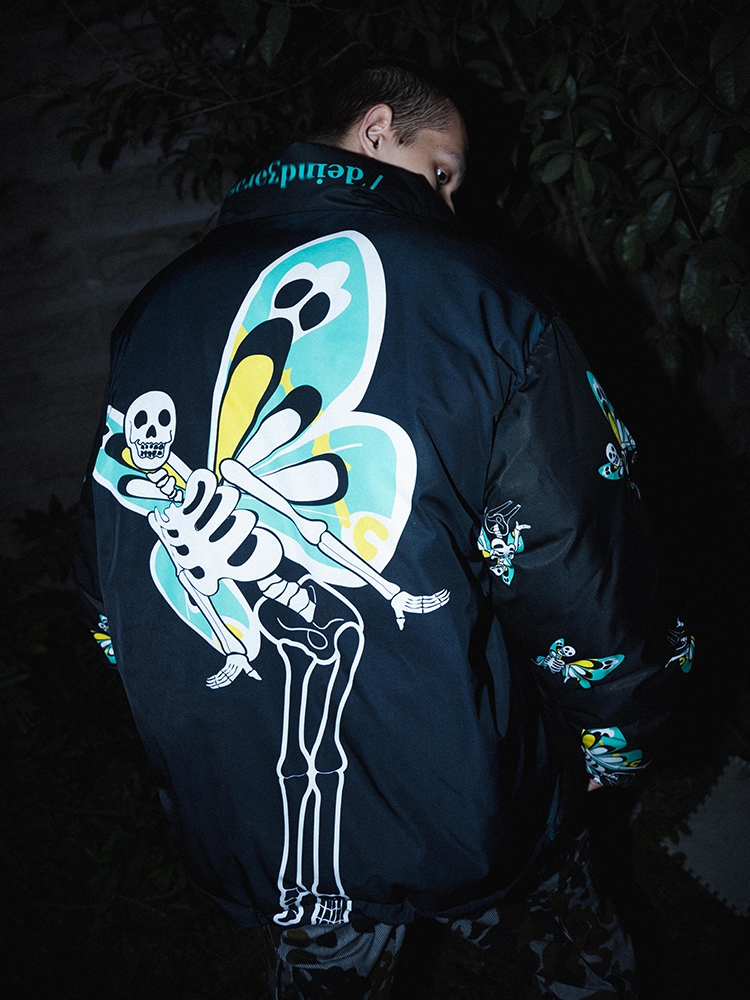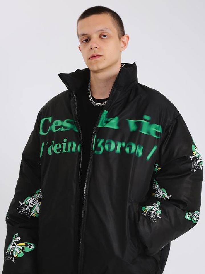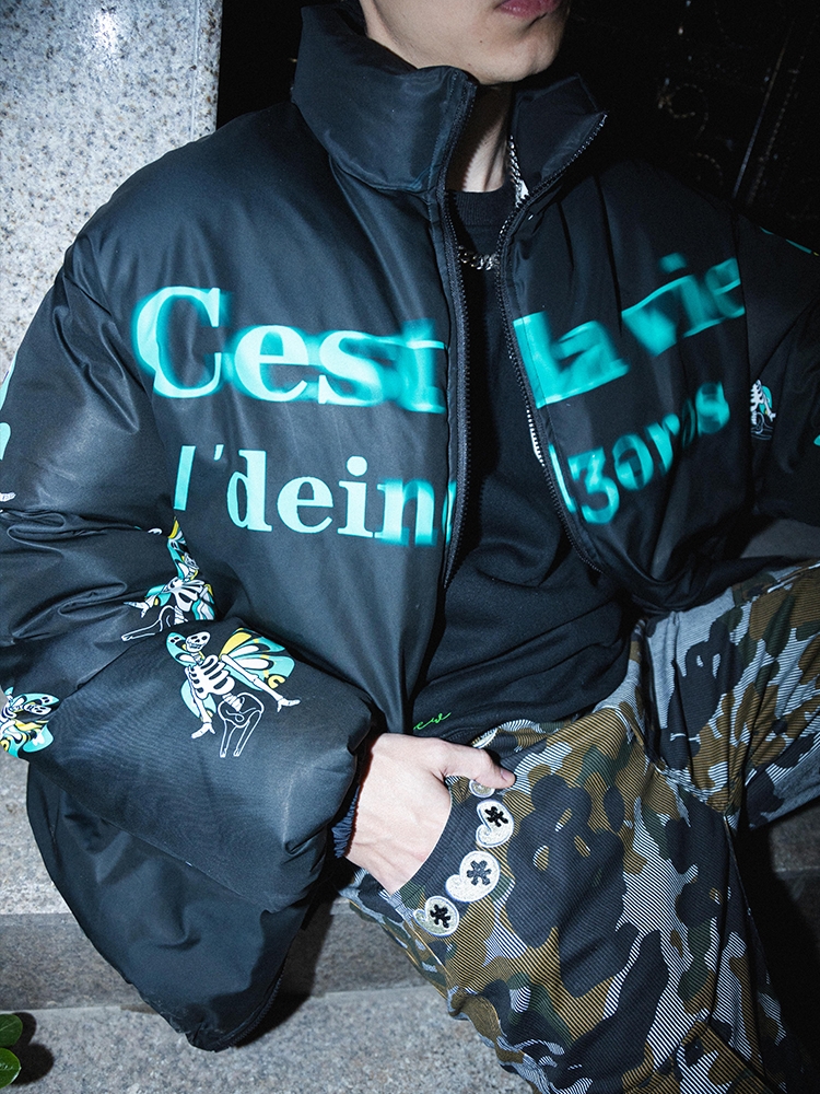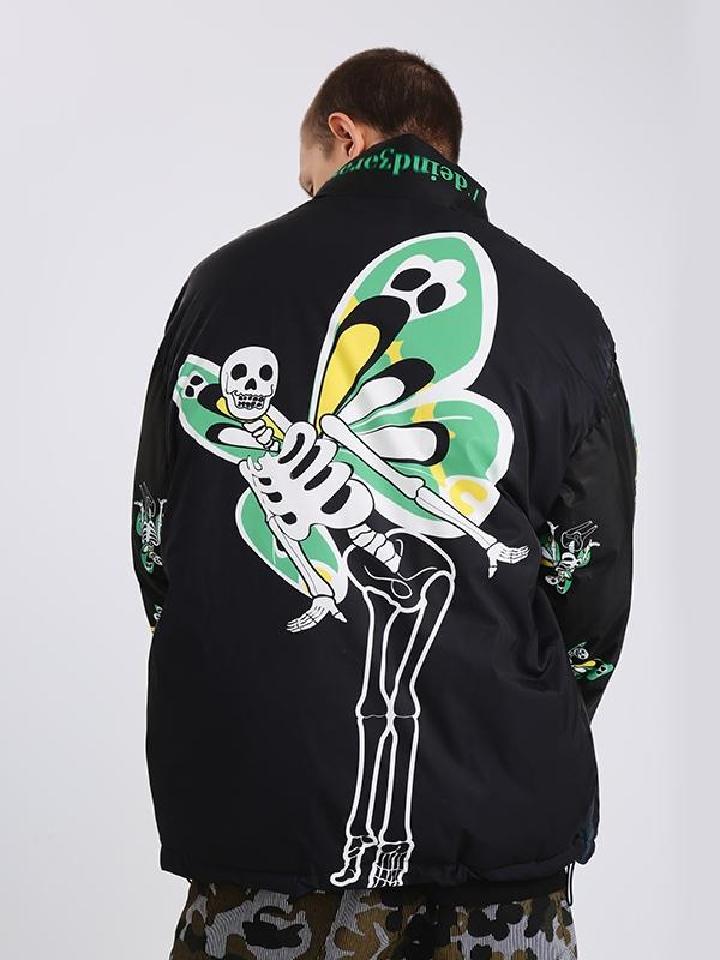 时髦有型的棉服与黑色结合,打造出man力十足的男子汉气场,看起来潮范难挡。蝴蝶骷髅仙子印花装饰,凸显出男性的潮酷魅力,颇具街头感。