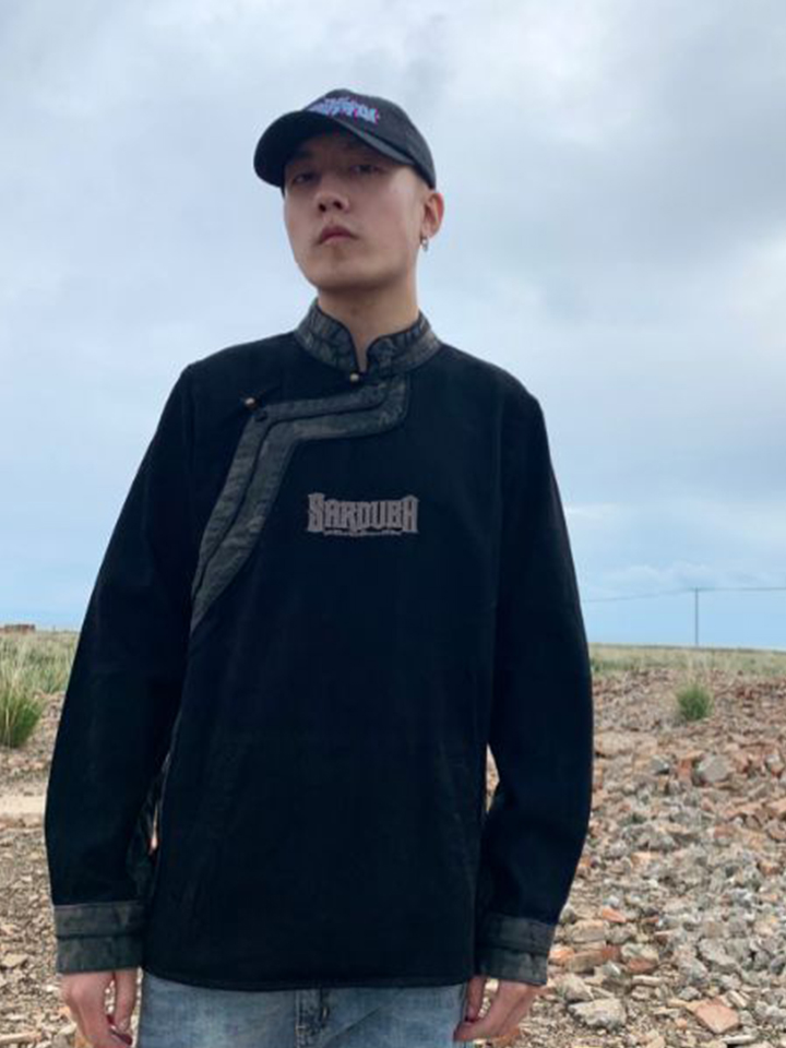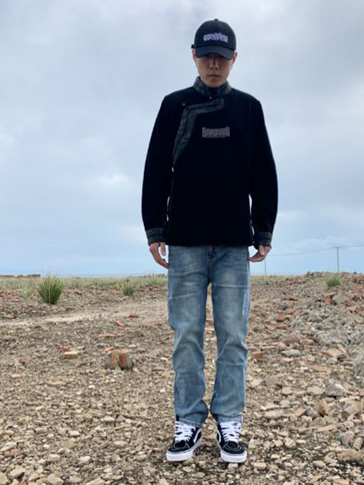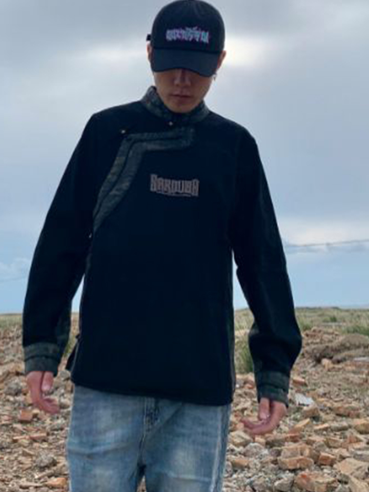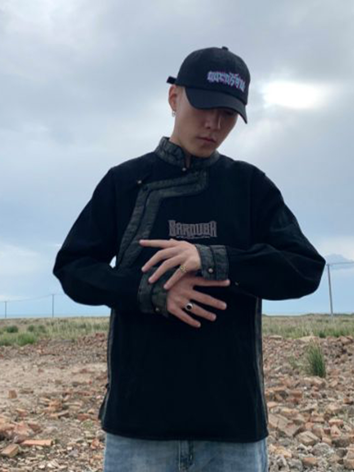 黑色的牛仔衬衣采用藏式的领口设计,胸前增添字母刺绣。