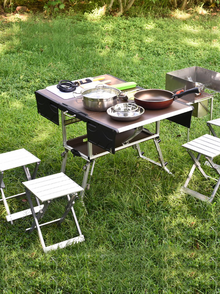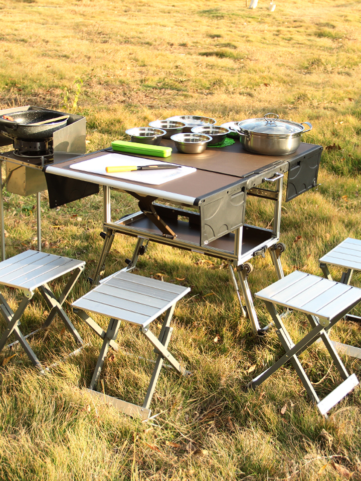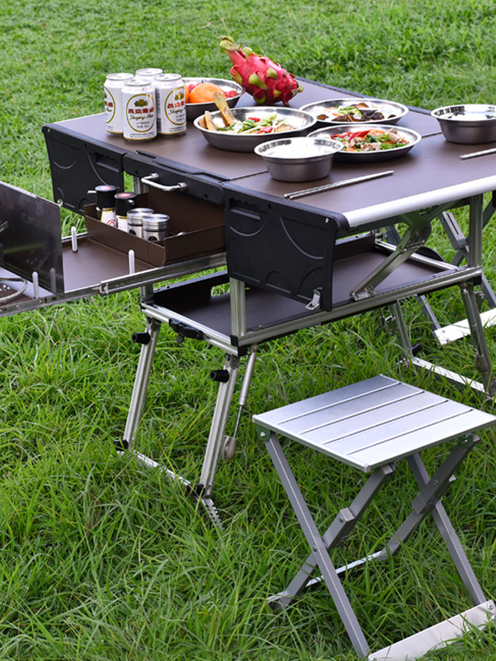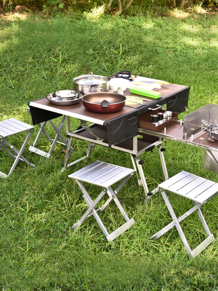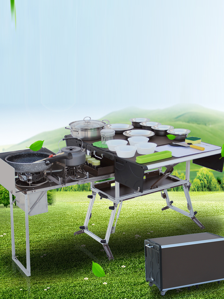 6061高强度铝合金骨架,重量轻,承重强,结实耐用。方便快捷的折叠方式,有效解决传统灶台收纳体积大,携带不方便的问题。超大的操作台面,使用方便。悬空可调式炉架设计,适合各种炉具固定。